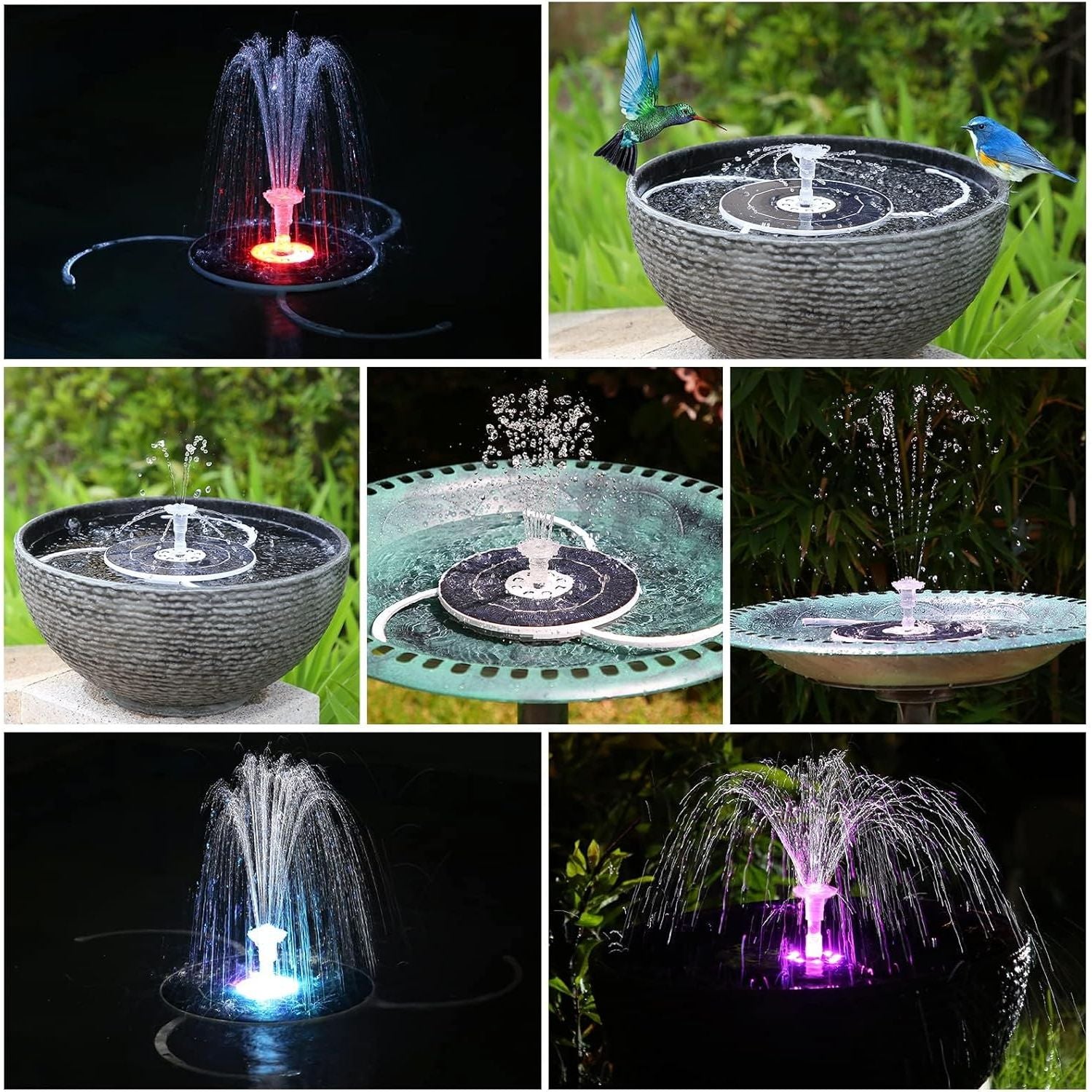 - [8 LED Solar Water Fountain]: The solar fountain pump is equipped with 8 LED lights, 10 different colors. Color automatic cycle running makes night views more beautiful. It comes with battery, it will be fully charged during the sunny day and can work after sunset up to 6 hours. Good decoration for outdoor.
