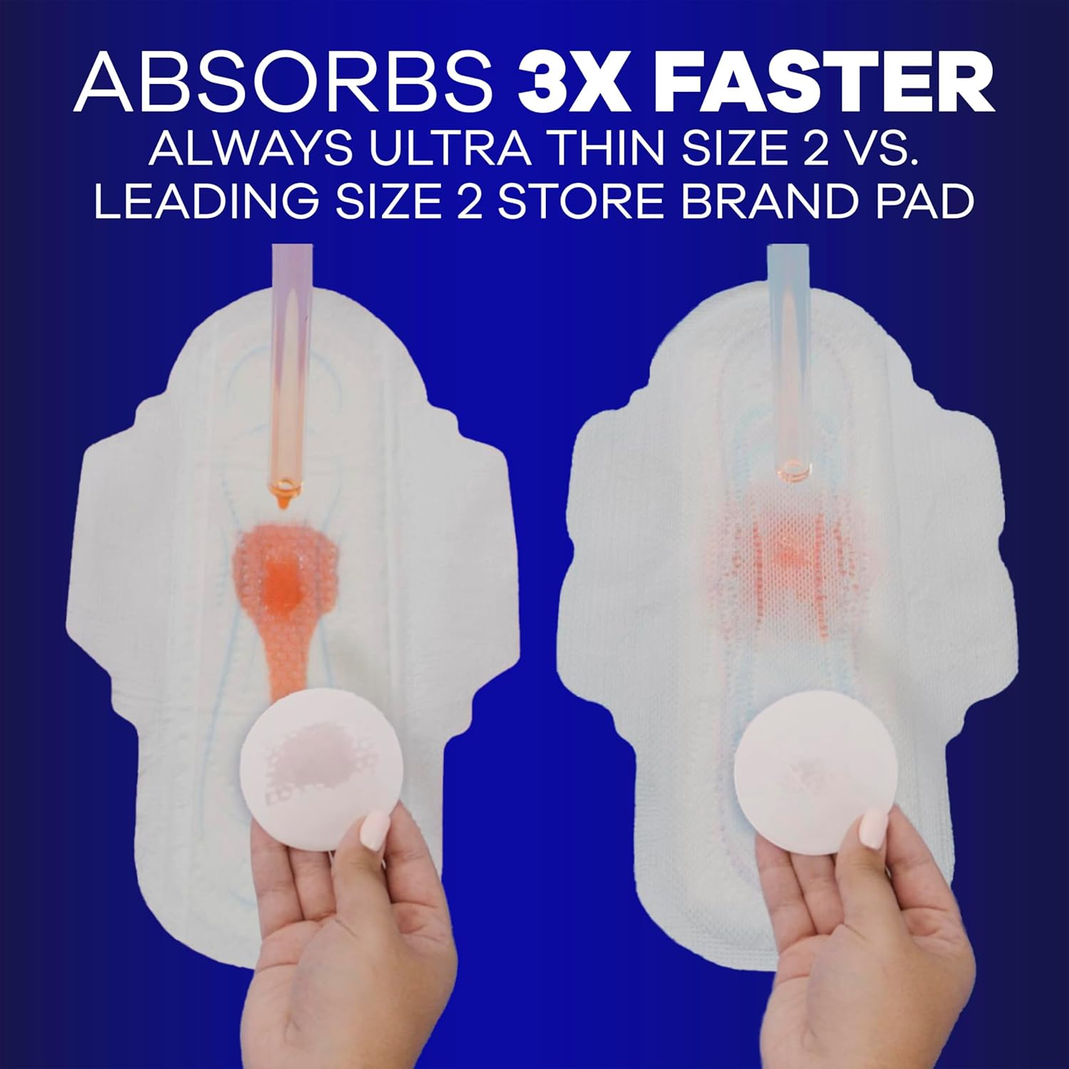 - ABSORBS 3X FASTER (Always Ultra Thin size 2 vs leading size 2 store brand pad)