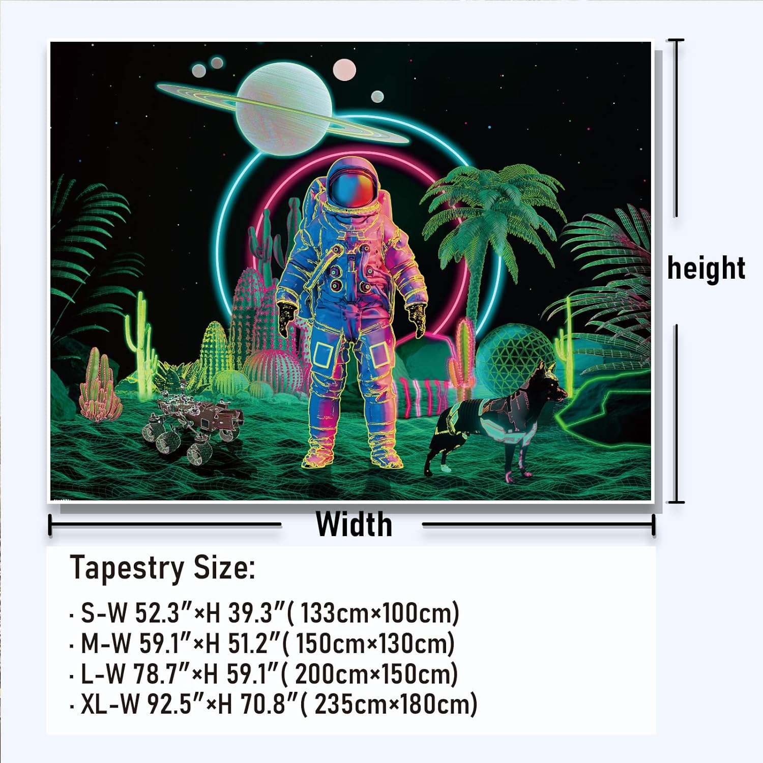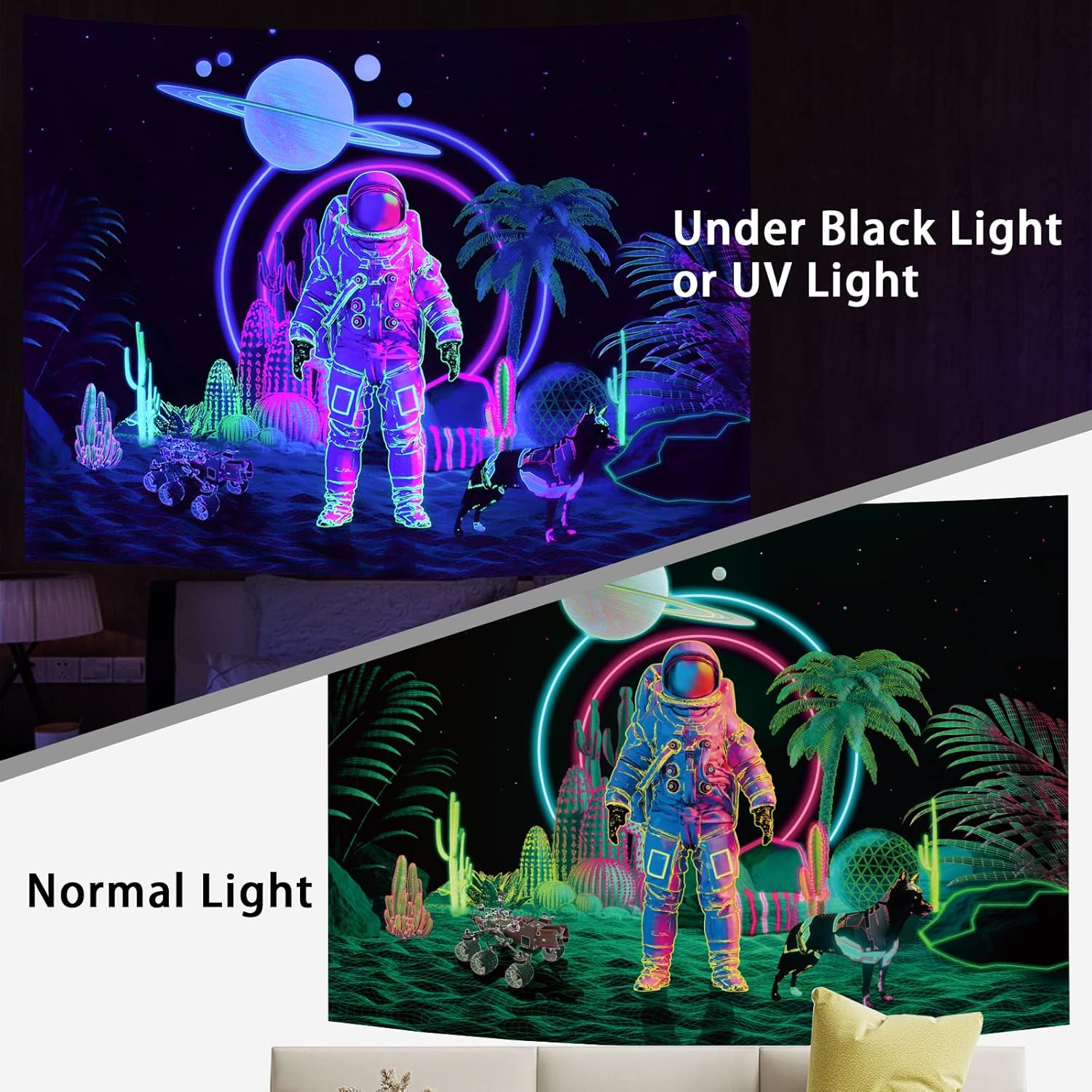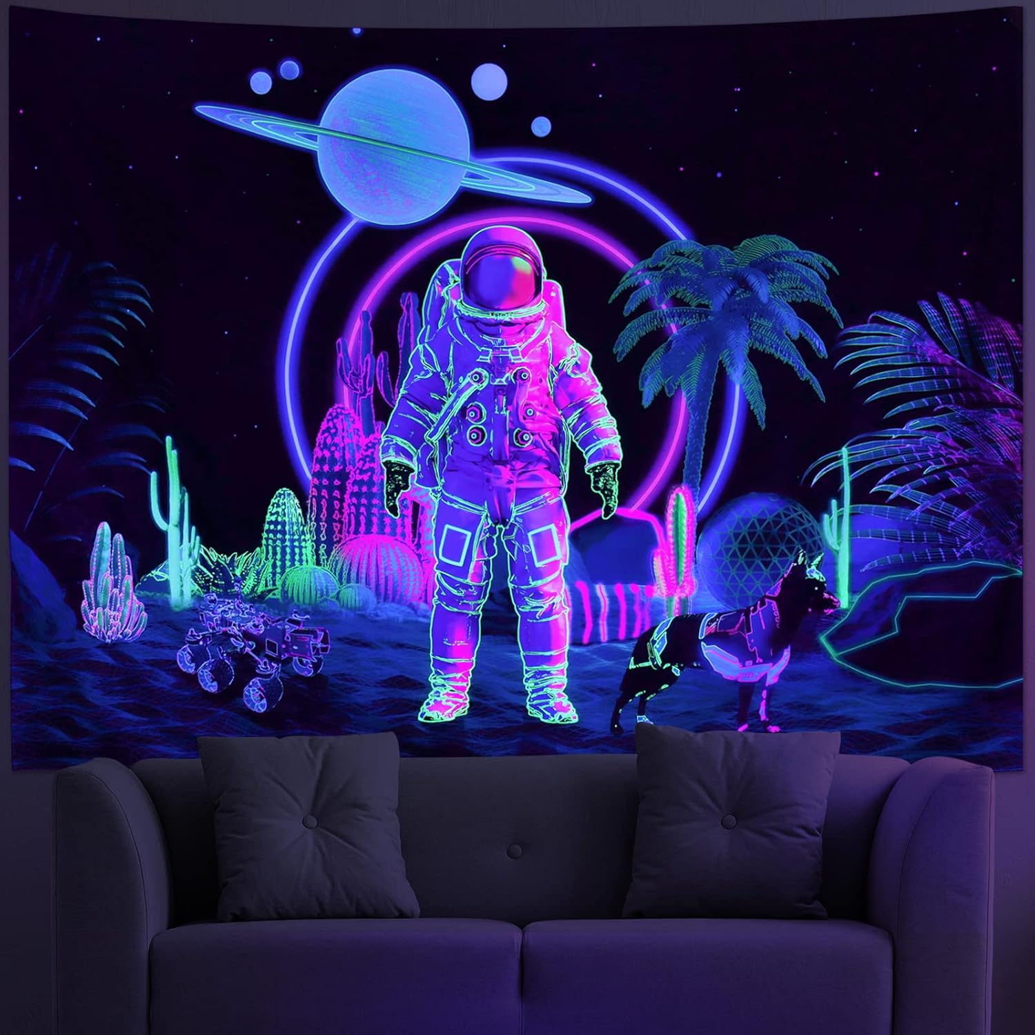 - Amonercvita Blacklight Astronaut Tapestry UV Reactive Planet Tapestries Neon Cactus Tapestry Galaxy Space Tapestries Black Light Palm Tree Wall Hanging for Room