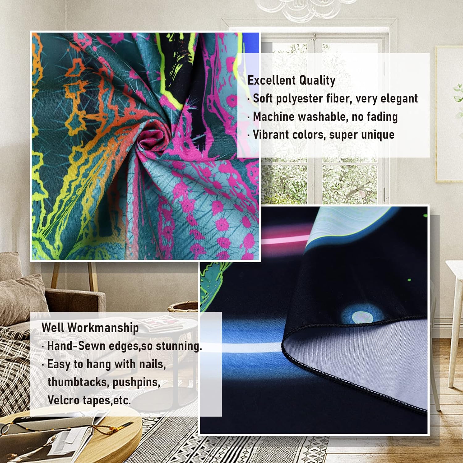 - FOUR SEASONS: The trippy cactus tapestry is durable and colorful enough that you can hang it to anywhere at anytime. It would be a perfect blacklight decor for living room, bedroom, dorm, office, studio, window, sofa, etc