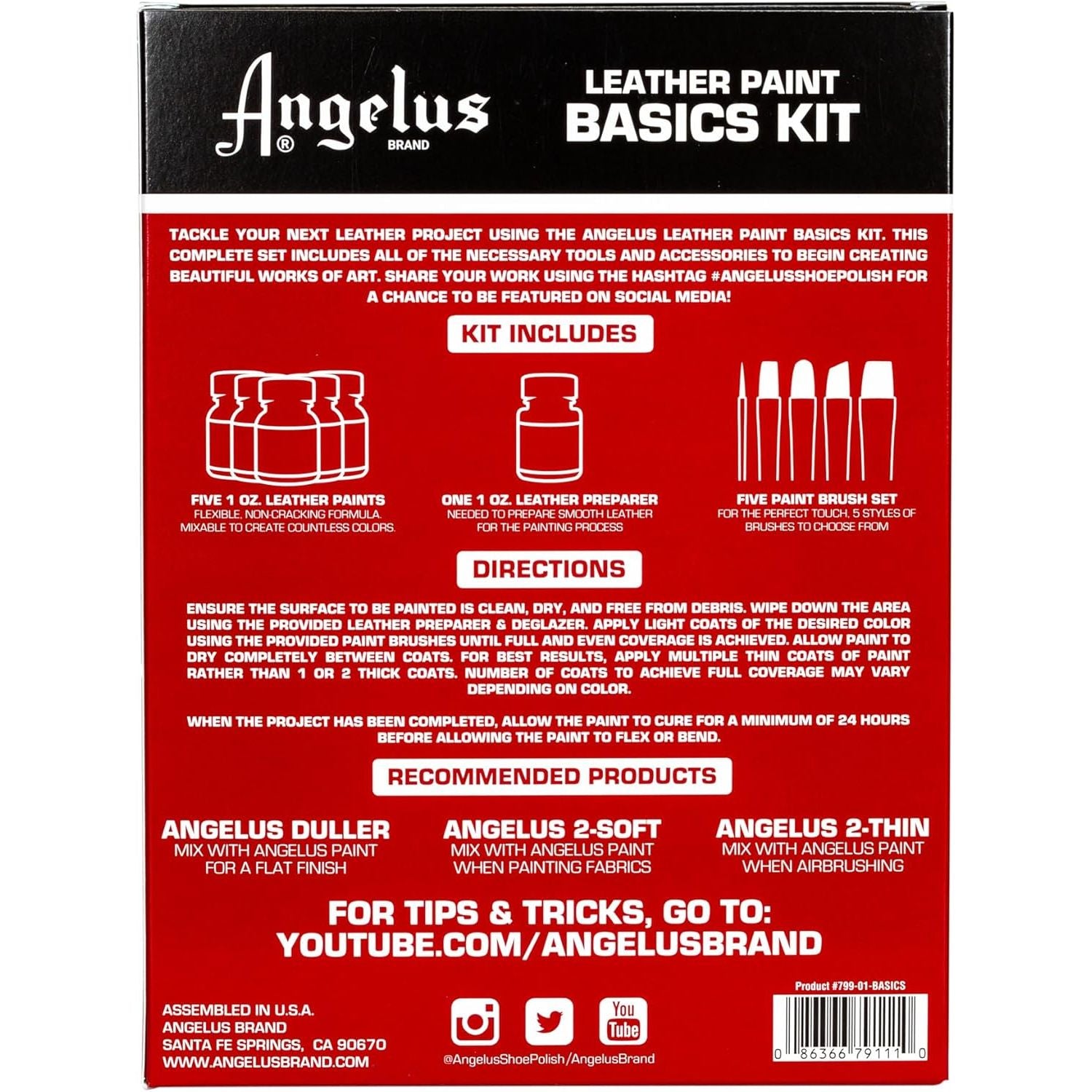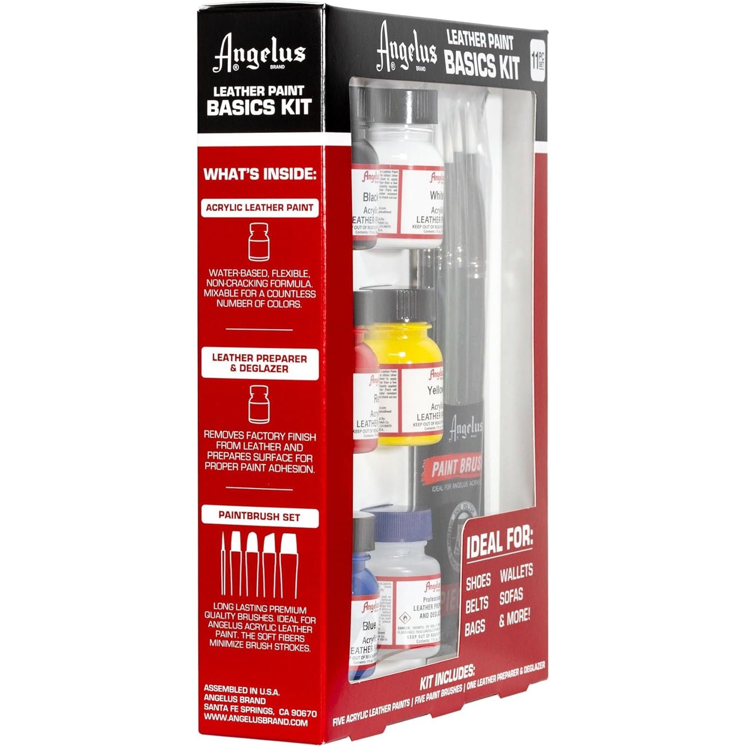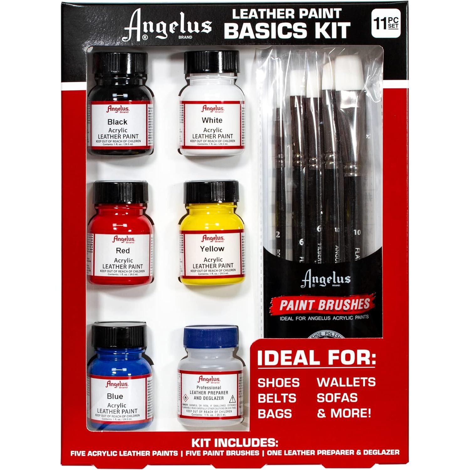 - Angelus Leather Paint Basics Kit – Acrylic Leather Paint Set with 5 Colors (1 oz. each), Preparer & Deglazer and Paintbrushes