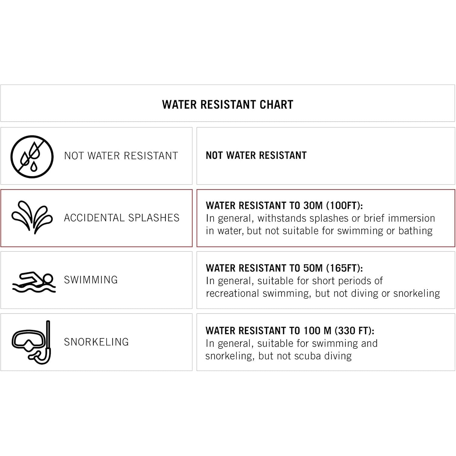 - Water resistant to 30m (100ft): in general, withstands splashes or brief immersion in water, but not suitable for swimming or bathing