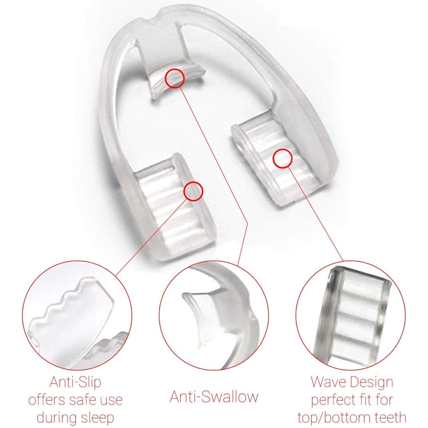 - SnoreeZ mouth guards Feature unique clench and grind absorbing bite plates to stop you from grinding your teeth during the night and to increase peaceful sleep. Relaxes jaw muscles to help prevent bruxism and clenching.