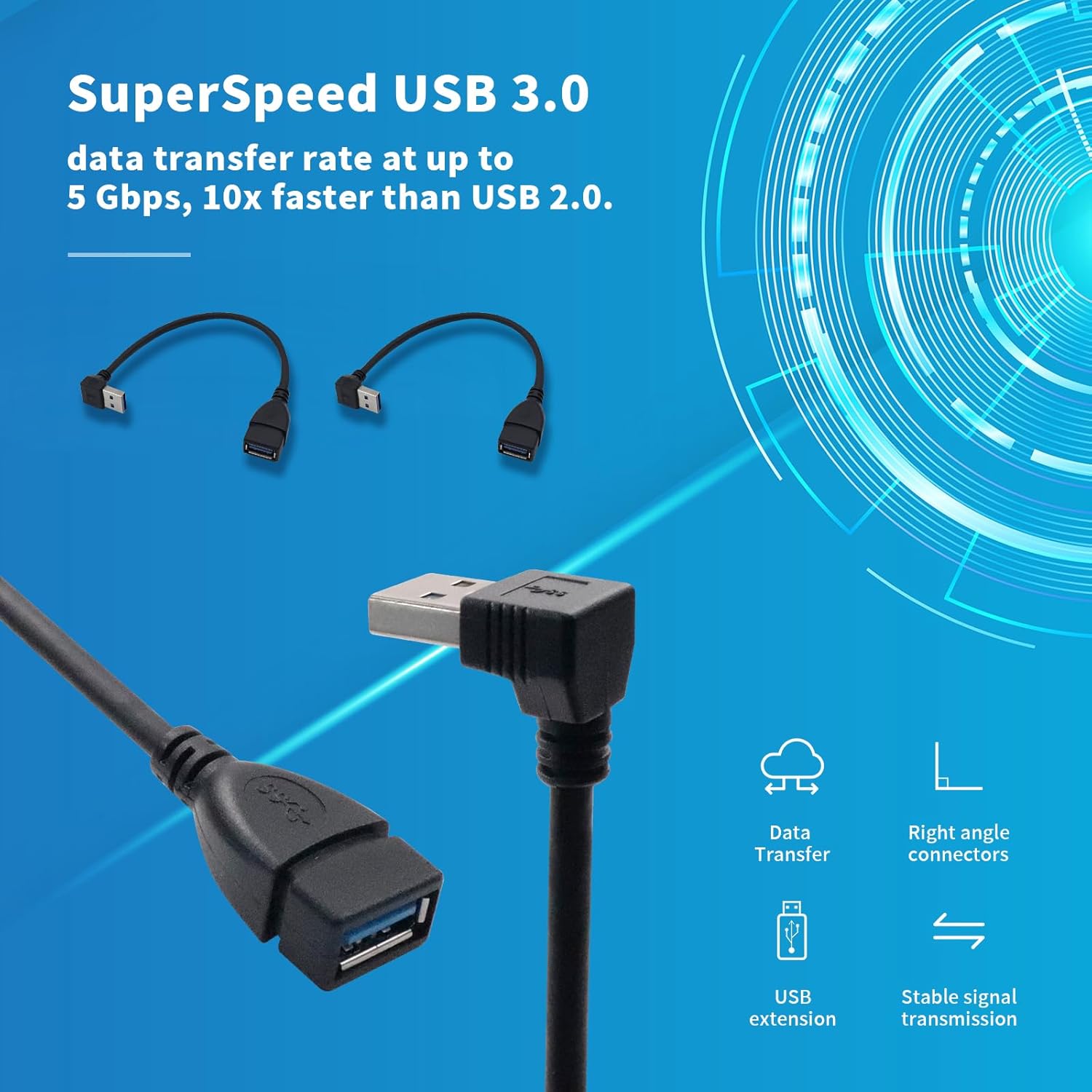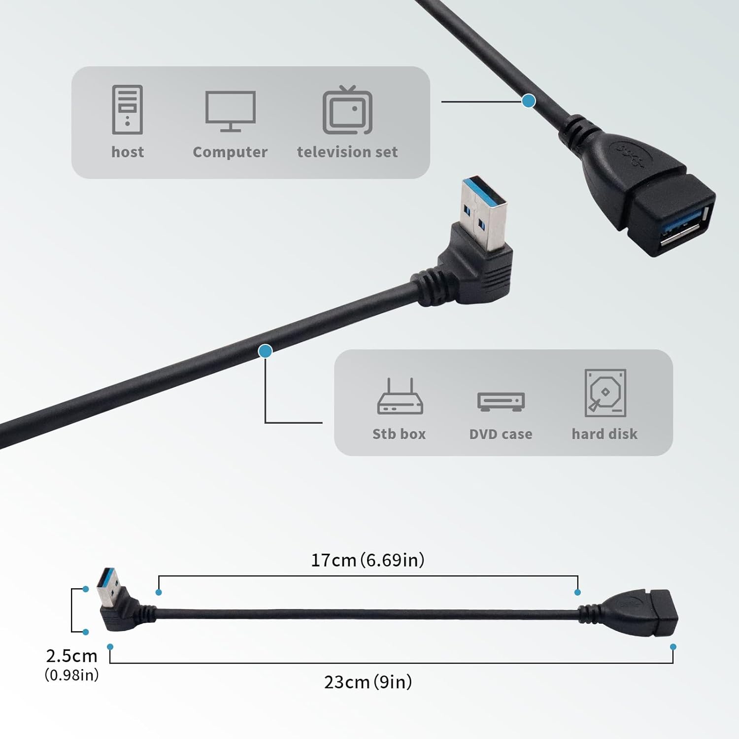 - Cable Length: 23cm/9" (Approx.); Plug and play. Package Content: 2 x USB 3.0 Cable Up 90 Degree Angle, 2 x USB 3.0 Cable Down 90 Degree Angle.