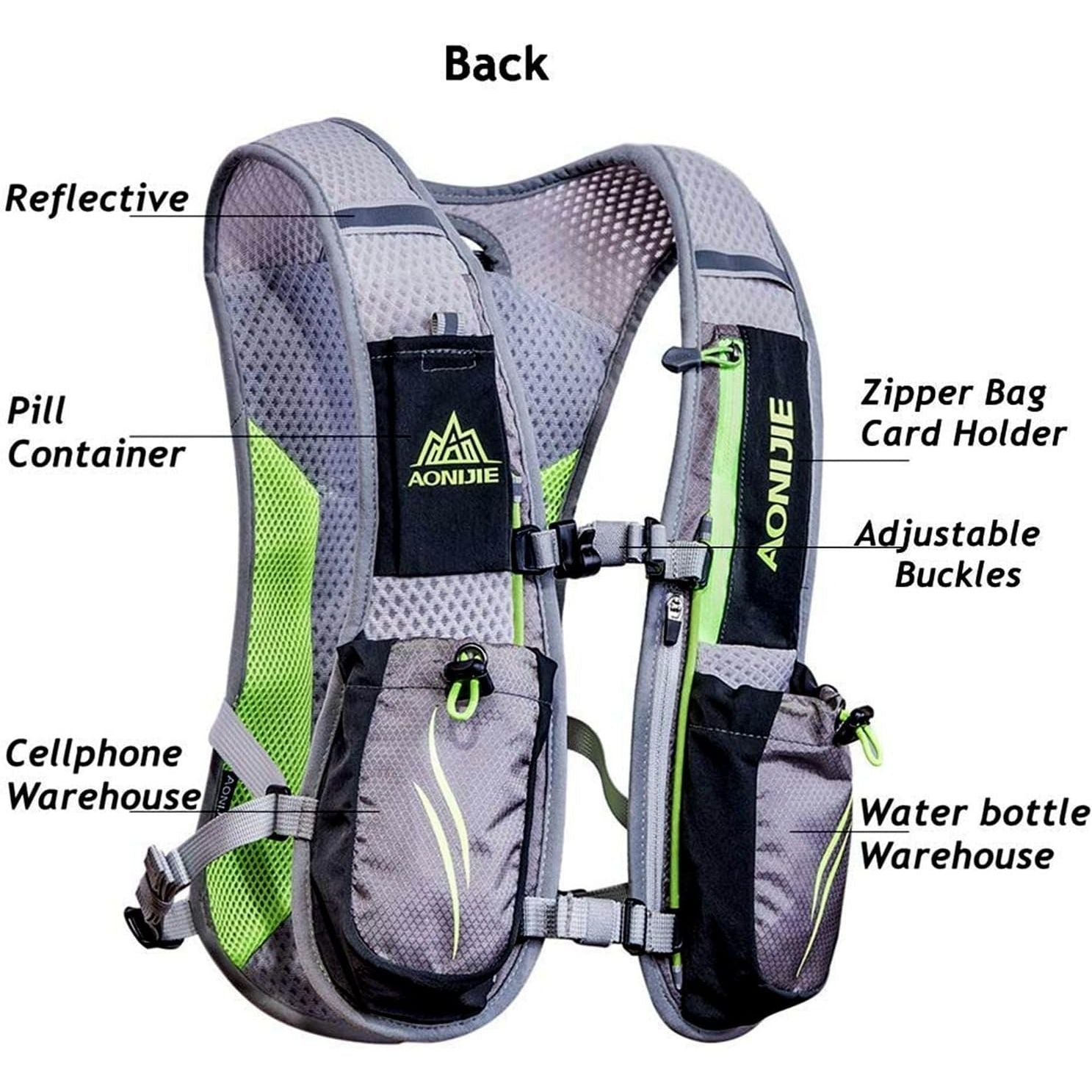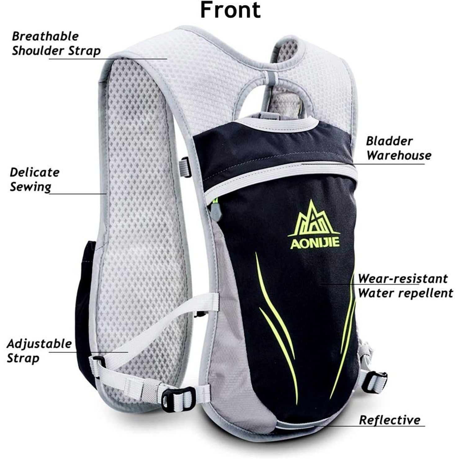 - Hydration System:Bladder compartment with hanging system,Aonijie running vest compatible with 2L bladder (not included);2 Front flask pockets with secure loops,Make it easy to drink and stays balanced when you run.