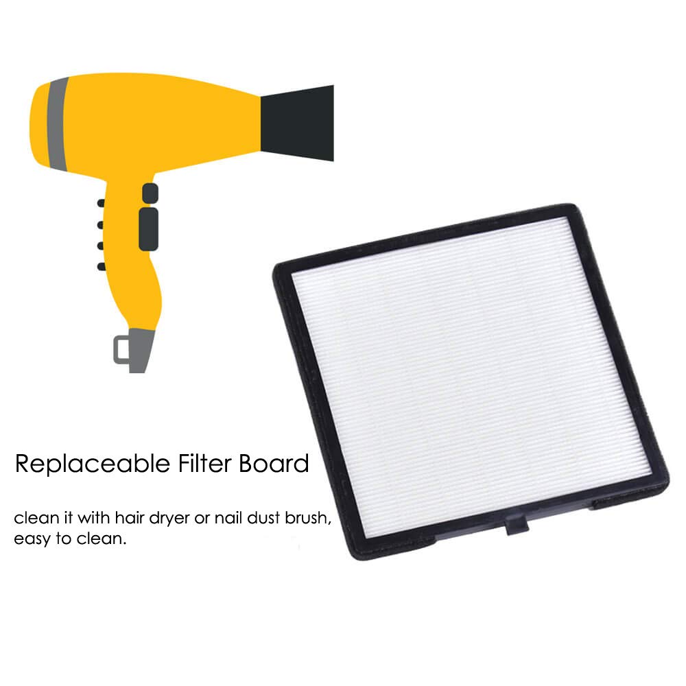 - Easy to clean nails fan dust collector, this device use replaceable filter board to catch the dust, after using, you can use hair dryer to blow the filter pad, more convenient. (Do not wash the filter pad.)