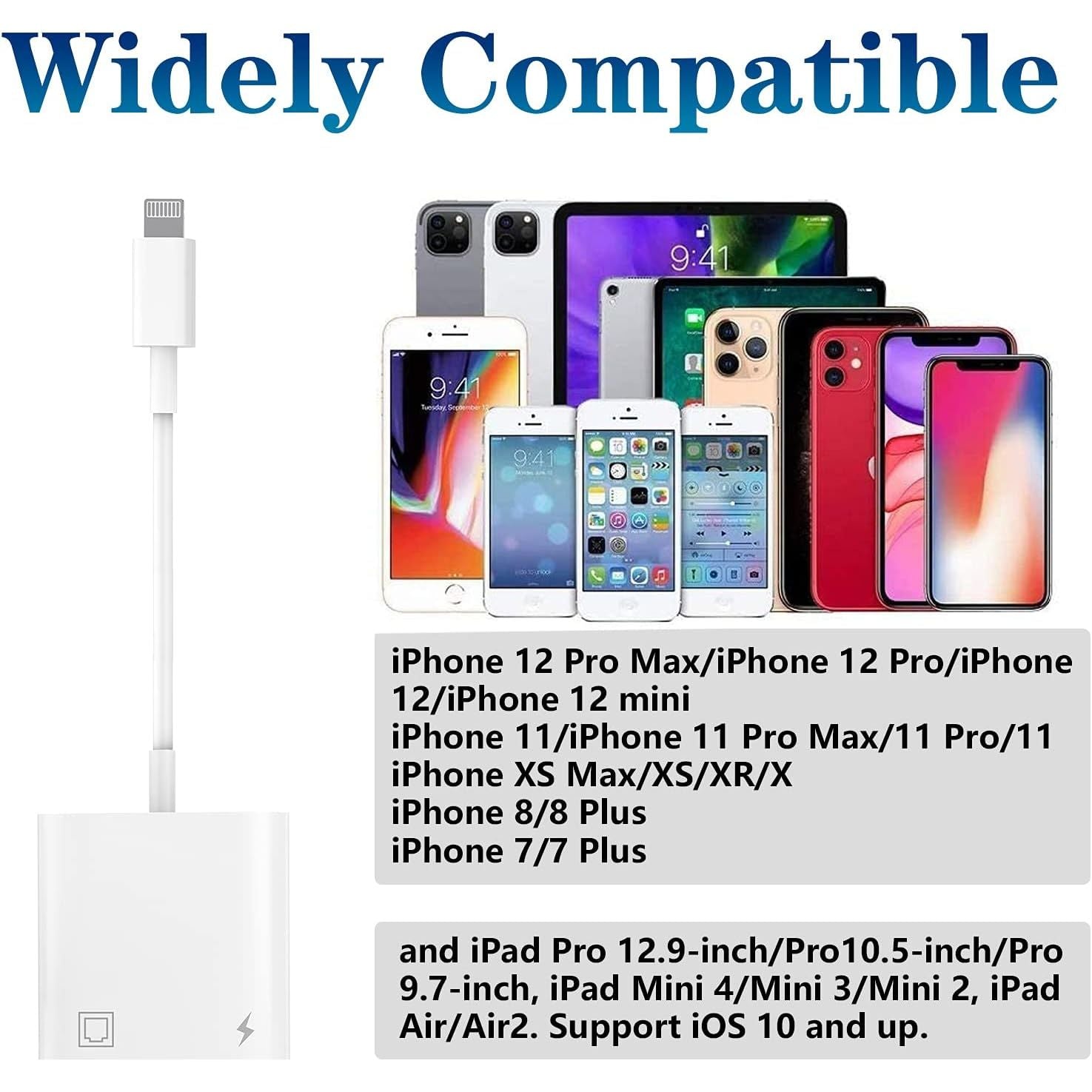2 in 1 Lightning to RJ45 Ethernet Adapter for iPhone/iPad, with Fast Charging Port, Portable Ethernet Adapter Compatible with iPhone, iPad, Plug and Play, Supports fast Internet transmission of up to 100Mbps Ethernet LAN wired network. Widely Compatible: iPhone 14 / 14 Plus / 14 Pro / 14 Pro Max iPhone 13 / 13 mini / 13 Pro / 13 Pro Max iPhone 12 / 12 mini / 12 Pro / 12 Pro Max iPhone 11/iPhone 11 Pro Max/11 Pro/11 iPhone XS Max/XS/XR/X iPhone 8/8 Plus iPhone 7/7 Plus and iPad Pro 12.9-inch/Pro10.5-inch/Pro 9.7-inch, iPad Mini 4/Mini 3/Mini 2, iPad Air/Air2. Support iOS 10 and up. How to Use? 1. Turn off Wi-Fi on your iPad or iPhone. 2. Insert your router-connected Ethernet cable into Ethernet port of adapter, and connect the Iightning end into your iPad or iPhone. 3. Go to"Setting" in your iPad or iPhone and Click the "Ethernet" to obtain an IP address. 4. Open Safari and check whether the network can be used normally. Please note: 1. Please make sure your router-connected Ethernet cable is connected to internet. 2. This adapter can't dial-up internet itself,need your router device provide a IP by DHCP service. 3. This adapter cannot work with the devices whose system is below iOS10.0. Please upgrade your system to iOS 10.0 or up before using it. 4.When connected to your mobile phone and network, the blue light will light up and flash, which greatly facilitates your use, so you don’t have to worry about whether the adapter is ready to work. Packing List: 1 x 2 in 1 RJ45 Ethernet Adapter for iPhone 1 x User Manual