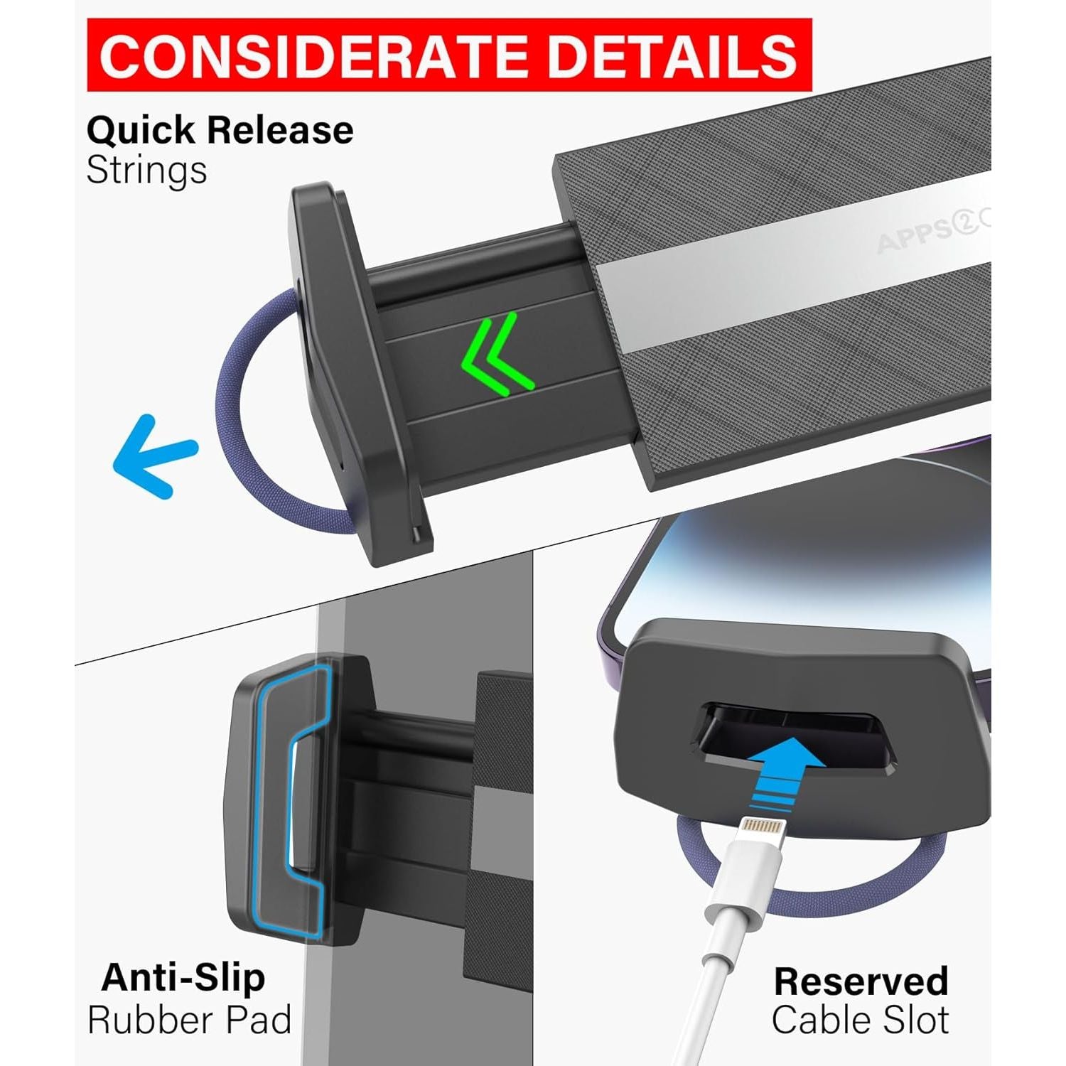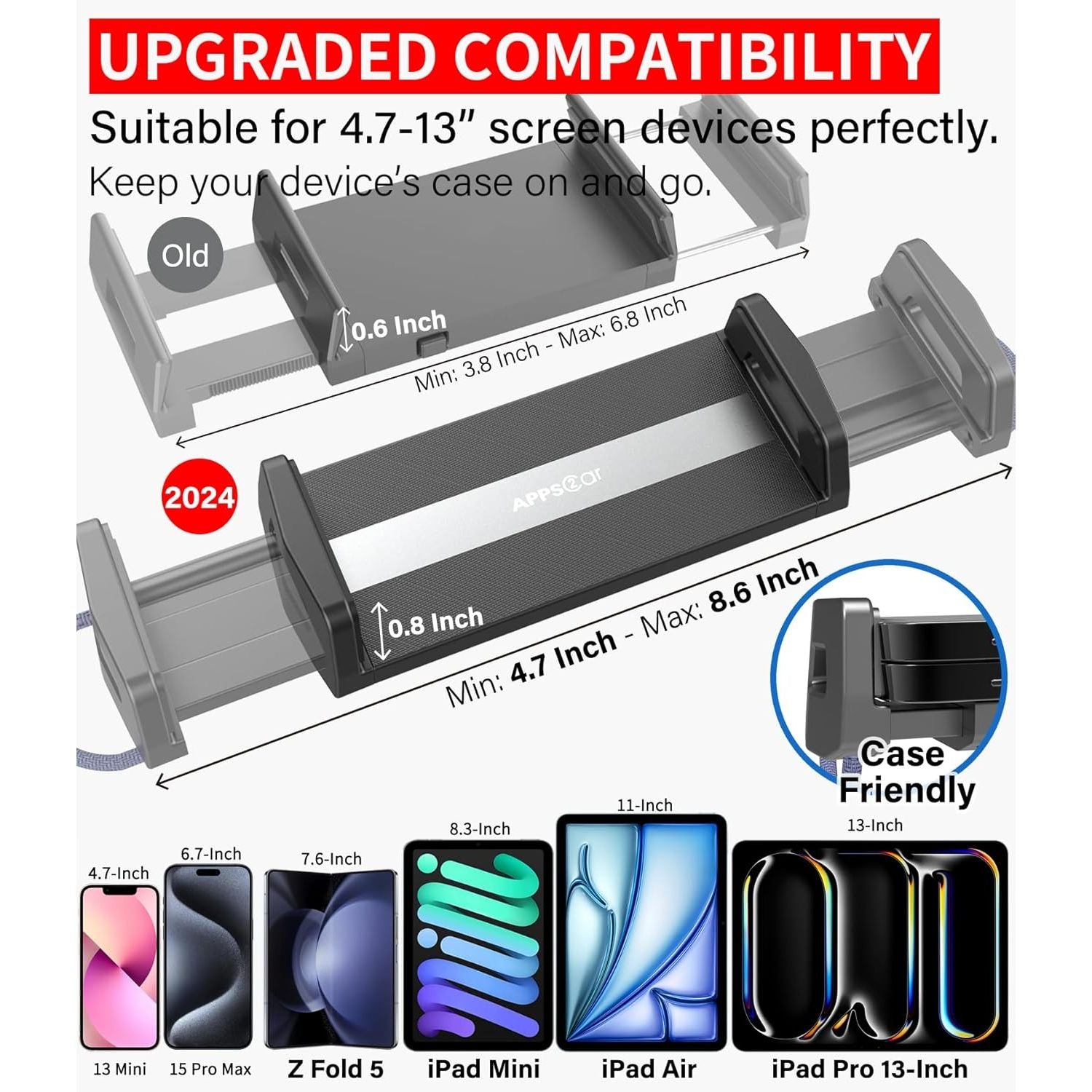 - Universal Compatibility: With two strings, you can quickly adjust the tablet clamp holder to fit most devices with screens 4.7 to 13 inches. Compatible with all iPads Pro Air Mini, iPhone, Samsung Galaxy tablets, Z Fold 5 4 3 2 1, all smartphones