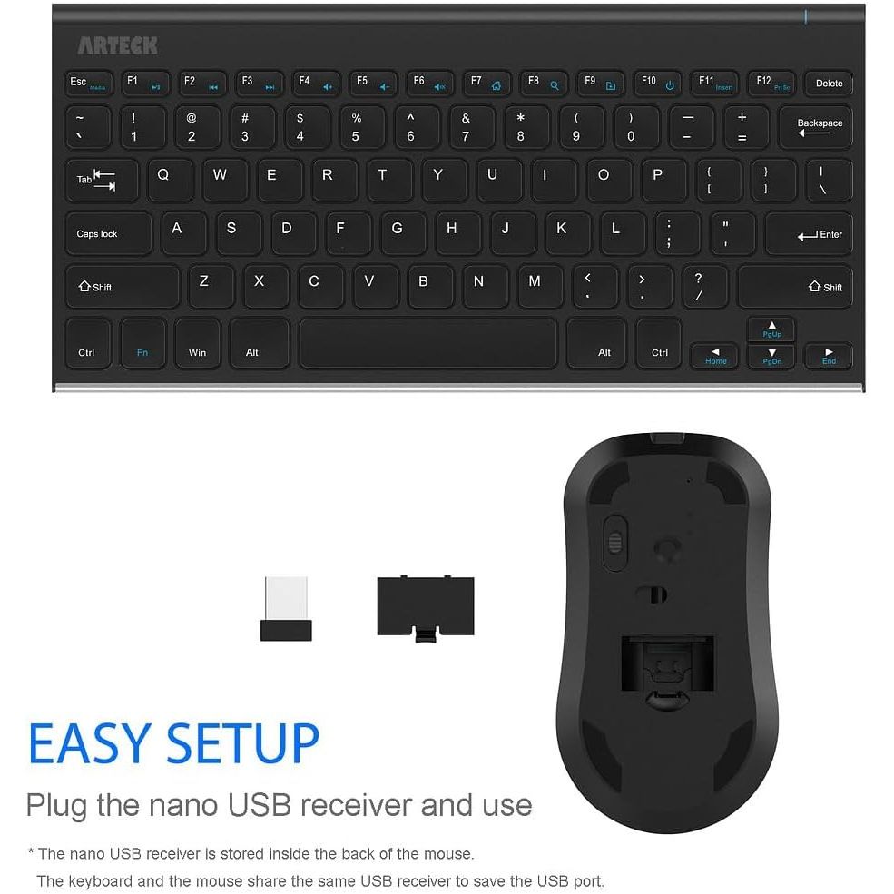 - What You Get: Arteck HW086 Wireless Keyboard, MW162 Wireless Mouse, one nano USB receiver for both keyboard and mouse (stored in the back of the mouse), USB charging cable, welcome guide, our 24-months warranty and friendly customer service.