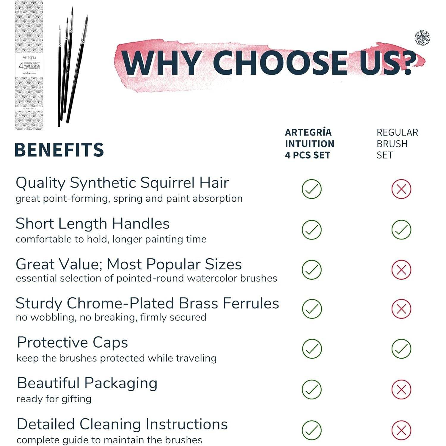 - ARTEGRIA Watercolor Brush Set, 4 Professional Pointed Round Soft Synthetic Squirrel Paint Brushes, Sizes # 2, 4, 6, 8