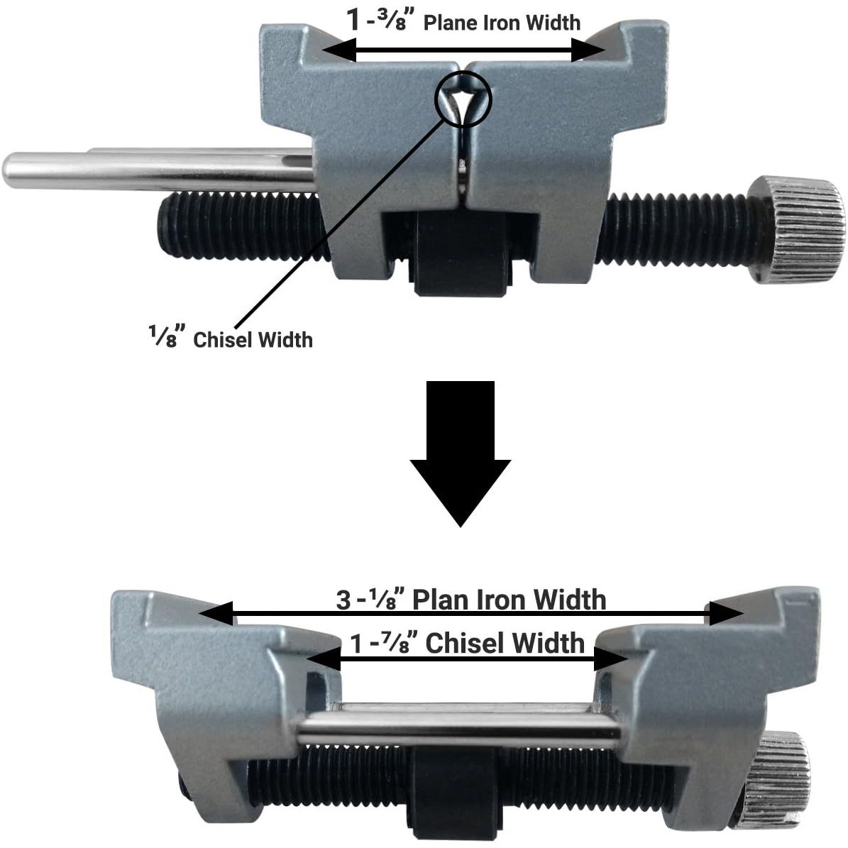 - Sizing & Compatibility – Self centering and fully adjustable, this sharpening guide will fit chisels from 1/8” to 1-7/8” in width, and plane irons from 1-3/8” to 3-1/8” in width. Includes flat jaws for clamping mortise chisels, and grooved jaws for clamping paring chisels and planer blades