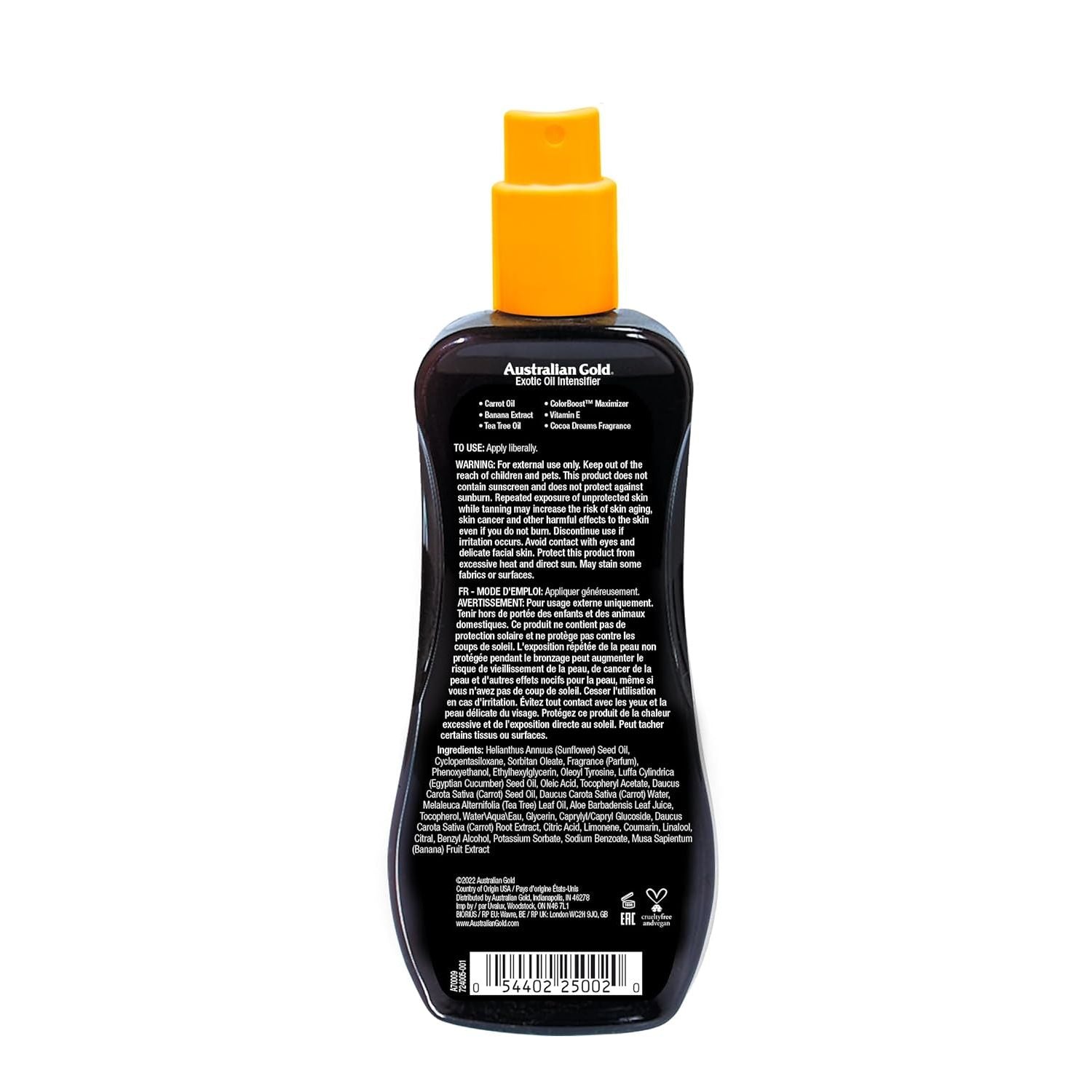 - NATURAL BRONZED LOOK - Australian Gold's Exotic Tanning Oil Intensifier contains Carrot Oil that enhances your tan to lend a darker shade, while keeping your skin moisturized for a perfect summer-ready body