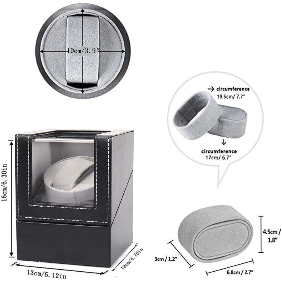 HIGH-GRADE MATERIAL High-grade Carbon Fiber Leather, Soft interior has been applied to protect your watch and avoid scratches.Japanese Motor+Soft Flannel Lined+Stainless Steel Chain+Acrylic Glass ULTRA-QUIET POLYCYCLIC ANTI-MAGNETIC MOTOR Extremely quiet and long lasting, running without noise for example without representing a distraction factor and fall asleep at ease at night MODEL OF SUCCESSFUL PEOPLE Elegant and vintage look is very popular among watch collectors which can help them solve much problem.Also can protect your expensive watch DUAL POWER SUPPLY SELECTION The watch winder can be powered by either AC adaptor or 2 batteries (AA). ROTATION MODE It is set to turn clockwise for around 2 minutes and then, it rest for 6 minutes. Resume counterclockwise for 2 minutes and pause for 6 minutes. It ensures your watch keeps running. APPLY TO DIFFERENT SIZES OF WATCHES his Rotation Area can fit a max 66 mm watch, and thickness reach to max 13 mm.The perimeter of the watch band is up to 210 mm (8.3 inch). PERFECT GIFT This watch winder could be a excellent and meaningful gift for your beloved one in anytime. Like New year, Christmas, Valentine's Day, Birthday, Father’sDay,Mother's Day, Graduation, Wedding, Anniversary ect. SPECIFICATION: External Material: Outer Black Carbon Fiber Leather Internal Material: Gray Bead Flannelette Motor: Imported Motor, Silent, No noise Dimensions: 4.75 x 5 x 6.3 inch (L x W x H) PACKAGE INCLUDE: 1 x Watch Winder 1 x Power Adapter 1 x User Manual