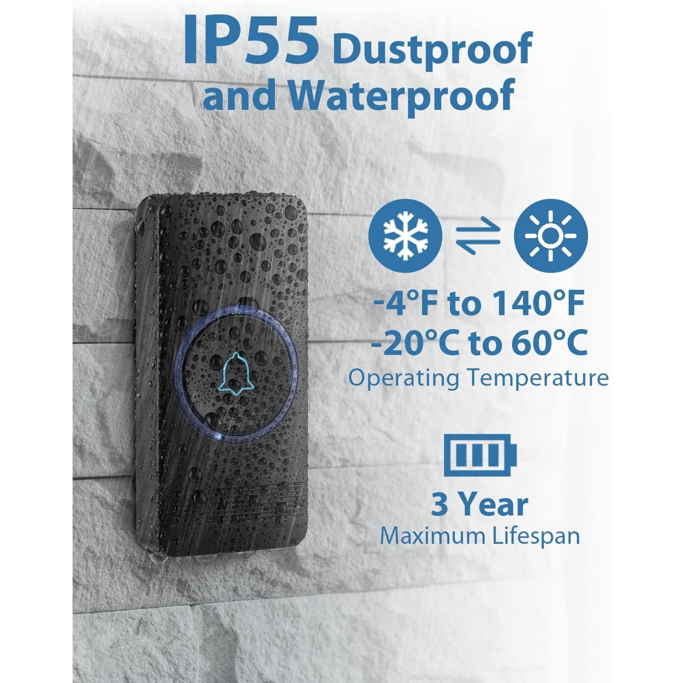 IP55 waterproof and functional between -4 °F to 140 °F, the doorbell can operate in even the harshest weather conditions.