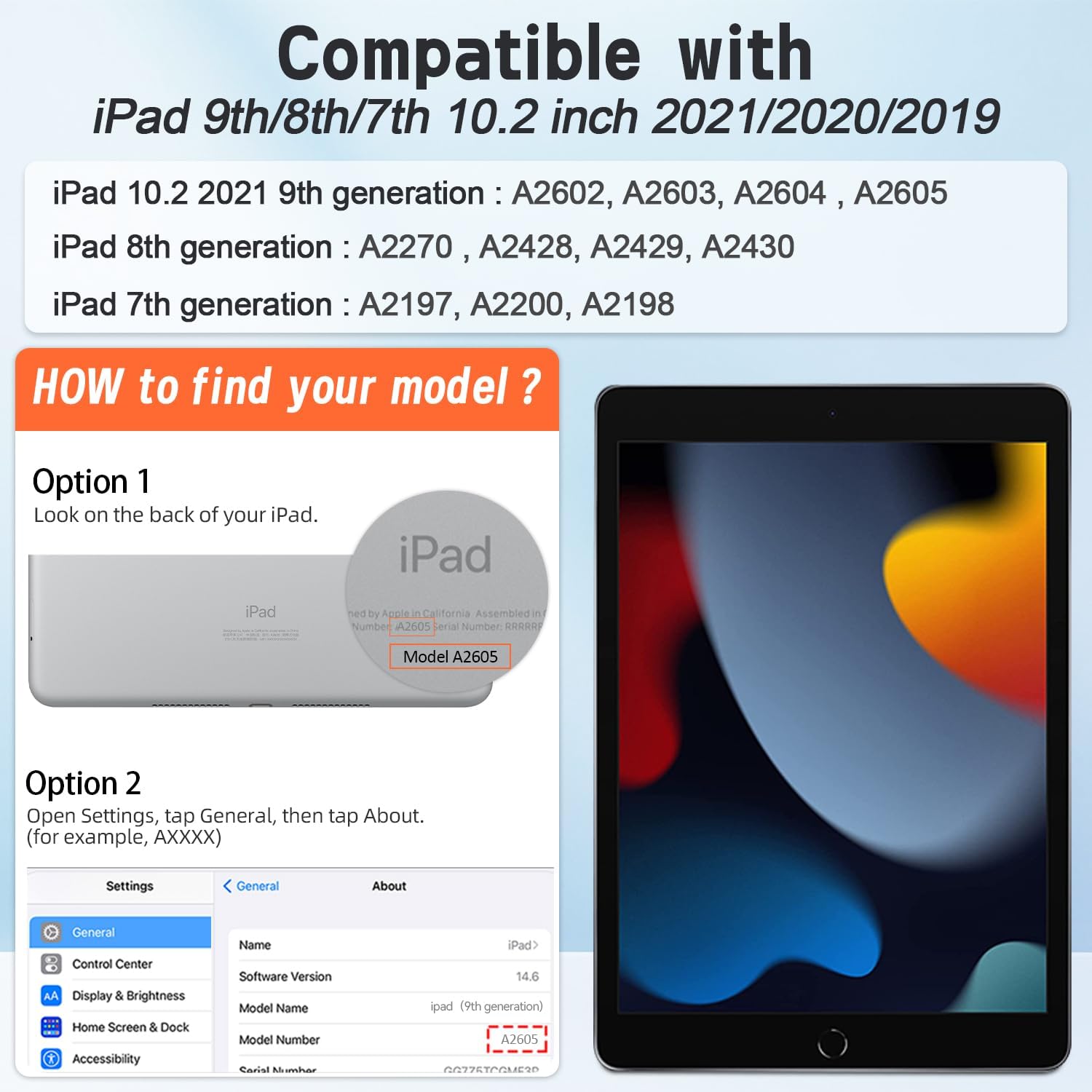 • ❥【Compatible with】: New iPad 10.2 2021 9th generation(A2602, A2603, A2604 , A2605), iPad 10.2 inch 2020, iPad 10.2 inch 2019, iPad 8th generation ( A2270 , A2428, A2429, A2430), iPad 7th generation ( A2197, A2200, A2198), iPad Air 3rd Generation 2019 (Model Number: A2152 A2123 A2153 A2154).