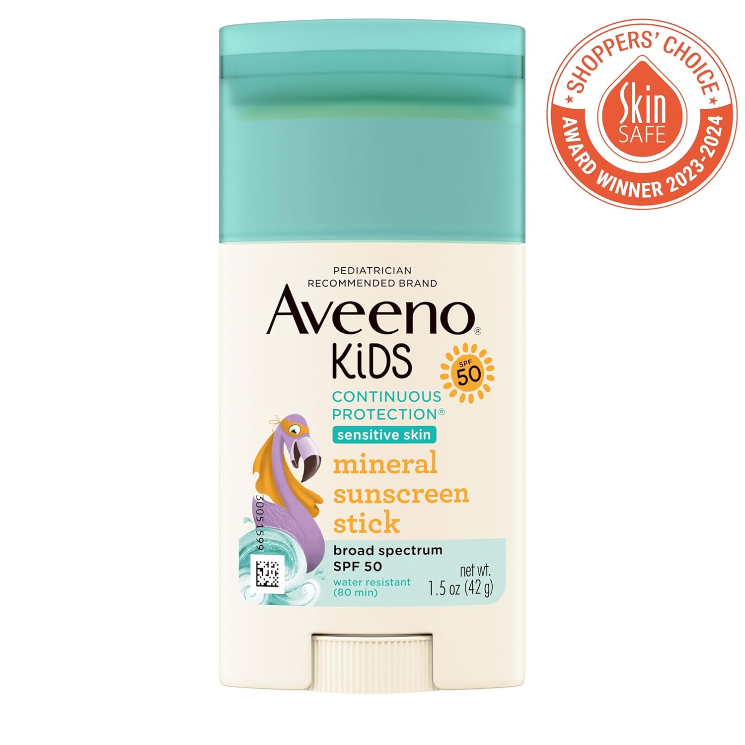 - Aveeno Kids Continuous Protection Zinc Oxide Mineral Sunscreen Stick for Sensitive Skin, Face & Body Sunscreen Stick for Kids with Broad Spectrum SPF 50, Sweat- & Water-Resistant, 1.5 oz
