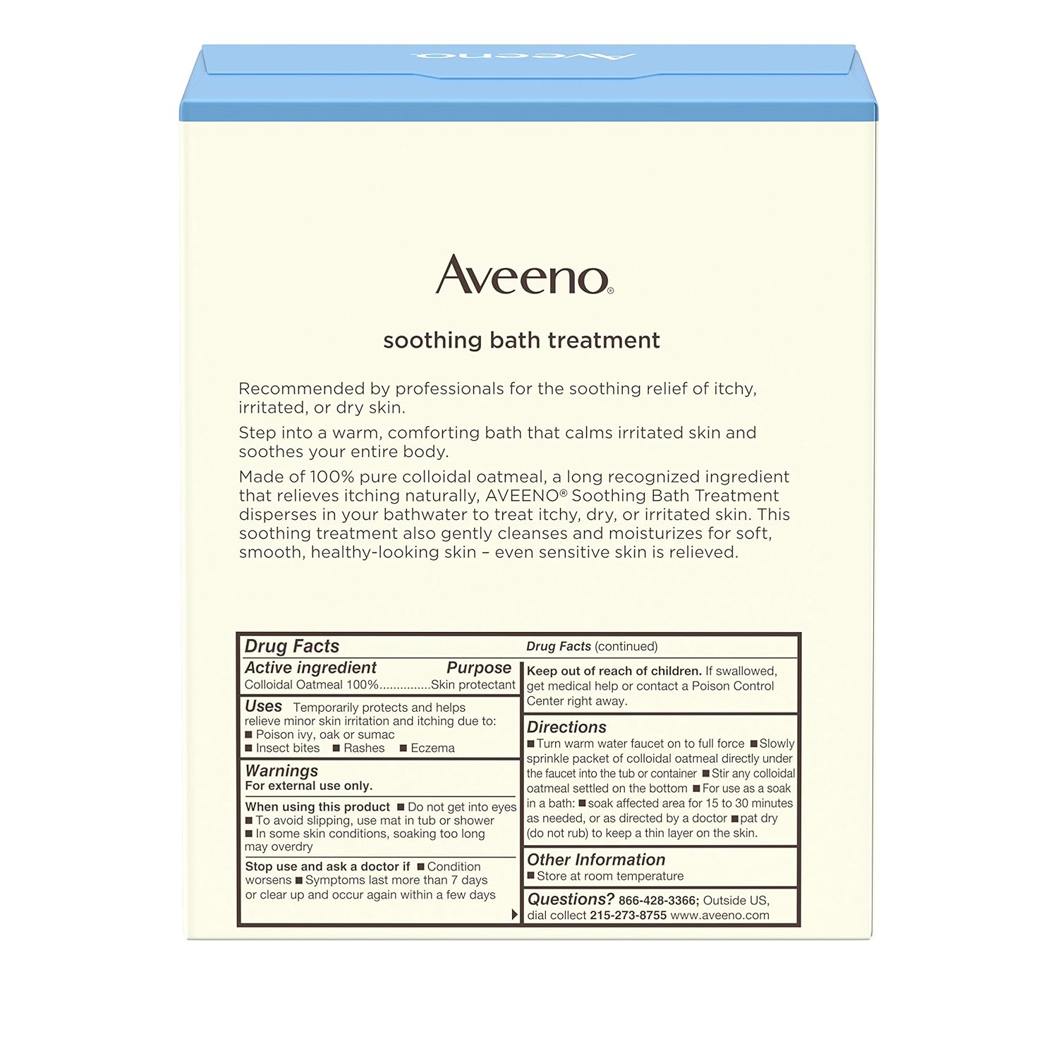 Aveeno Soothing Bath Treatment with 100% Natural Colloidal Oatmeal helps soothe and relieve dry, itchy, irritated skin. This dermatologist-recommended skin treatment temporarily protects skin and relieves itchiness while also gently cleansing and moisturizing skin, leaving it soft, smooth and healthier-looking. Its soothing formula is made with natural colloidal oatmeal, a long recognized ingredient that relieves itching naturally, to help soothe irritation due to poison ivy/oak/sumac, rashes, insect bites, eczema, insect bites, hives, sunburn, prickly heat and chicken pox. When dispersed in water, this fragrance-free skin soak forms a soothing milky bath treatment that is mild enough for sensitive skin.From the dermatologist-recommended brand for over 65 years, Aveeno uses the goodness of nature and the power of science to keep your skin looking and feeling healthy and balanced.