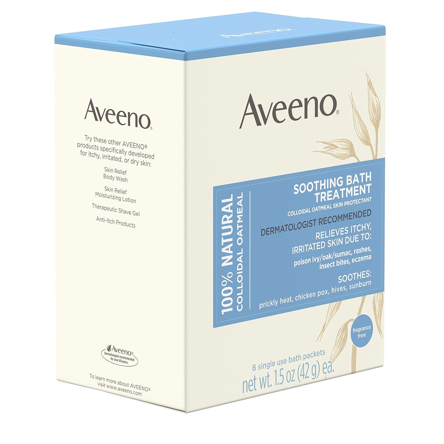 - 8-count of single-use packets of Aveeno Soothing Bath Treatment with 100% Natural Colloidal Oatmeal for temporary protection and relief of dry, itchy and irritated skin