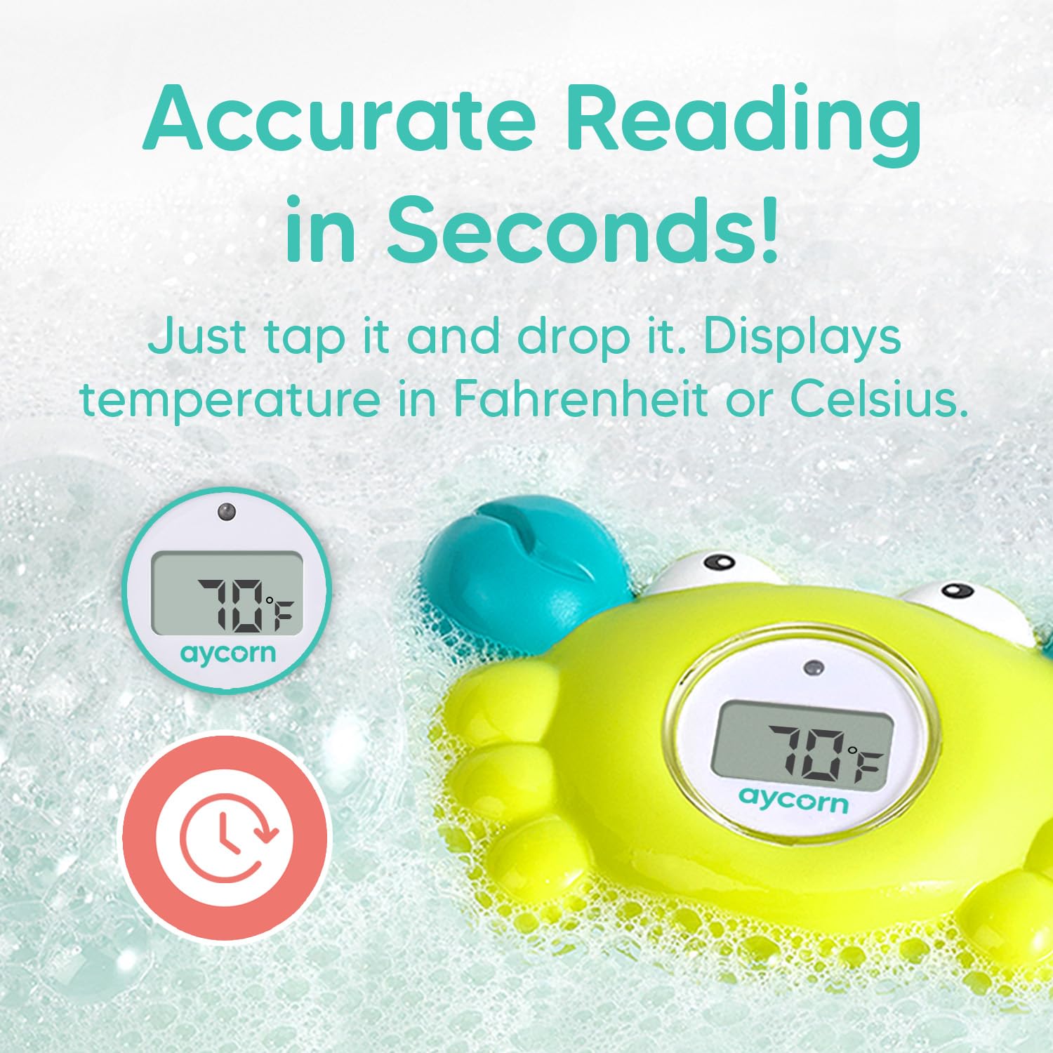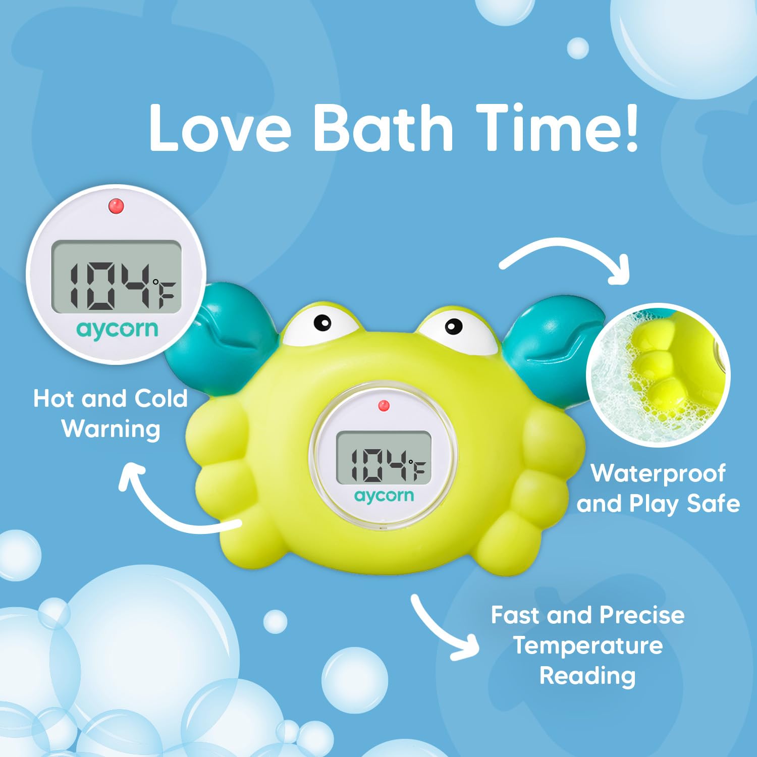 - Bath Time Fun! This baby thermometer is a cute, fun floating baby bath toy. It is the ideal size for your child to hold and interact with. Plus, Aycorn's water temperature thermometer is fully waterproof, meaning no sinking, no leaking and no worries!