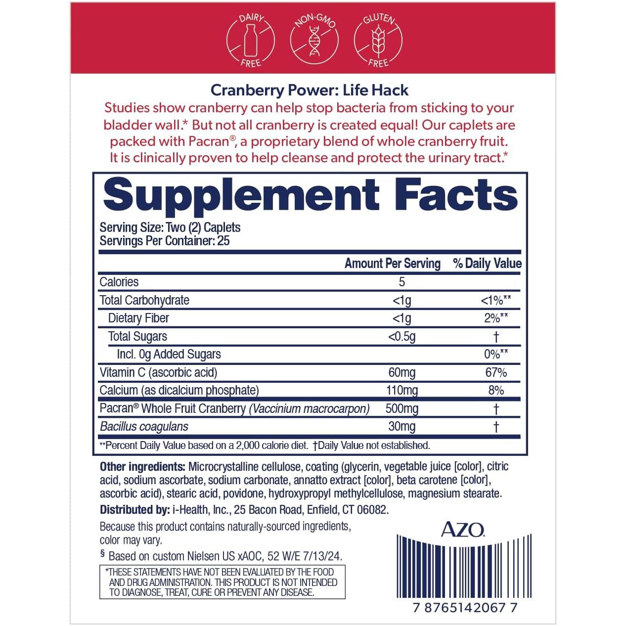Take AZO Cranberry Caplets as part of your daily routine to maintain a healthy urinary tract! Tired of drinking cranberry juice? Get the urinary tract benefits of one glass of cranberry juice in just 1 serving of AZO Cranberry caplets. These convenient, easy to swallow caplets are specifically formulated to help maintain a healthy urinary tract. AZO Cranberry is made with clinically proven Pacran, a super-concentrated whole fruit cranberry powder that helps flush to maintain urinary tract cleanliness.
