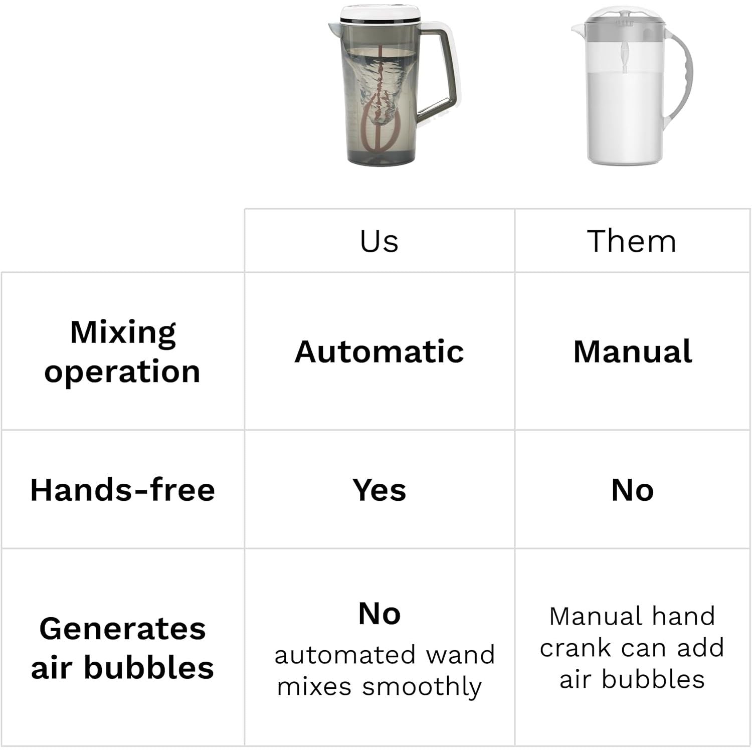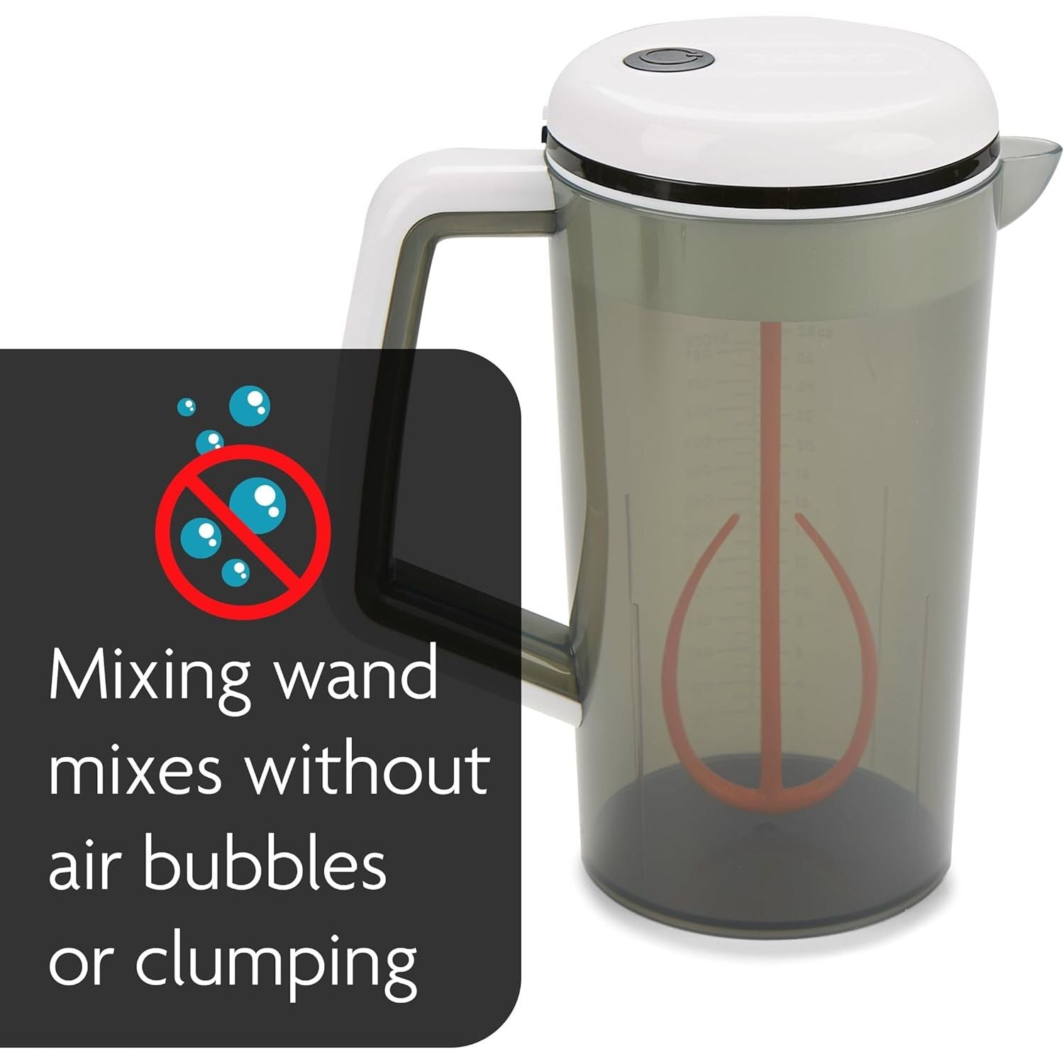 - AUTOMATICALLY MIXES WITHOUT AIR BUBBLES, CLUMPING OR EFFORT: First motorized formula pitcher that mixes formula at the push of a button without air bubbles, clumping or effort unlike manual mixing pitchers that require hand cranking