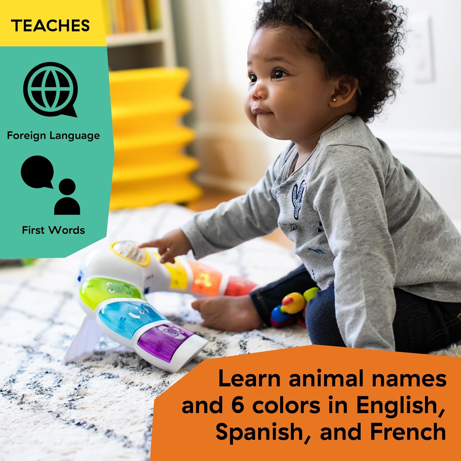 - 3 modes: Xylophone Mode helps baby create a song. Animal Mode teaches animal names and sounds. Color Mode teaches 6 color names in 3 languages – English, Spanish, and French.