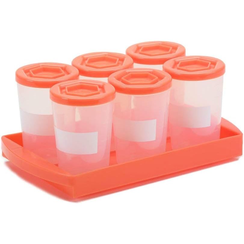- Set includes 6 stacking 4oz plastic jars and a stackable freezer tray