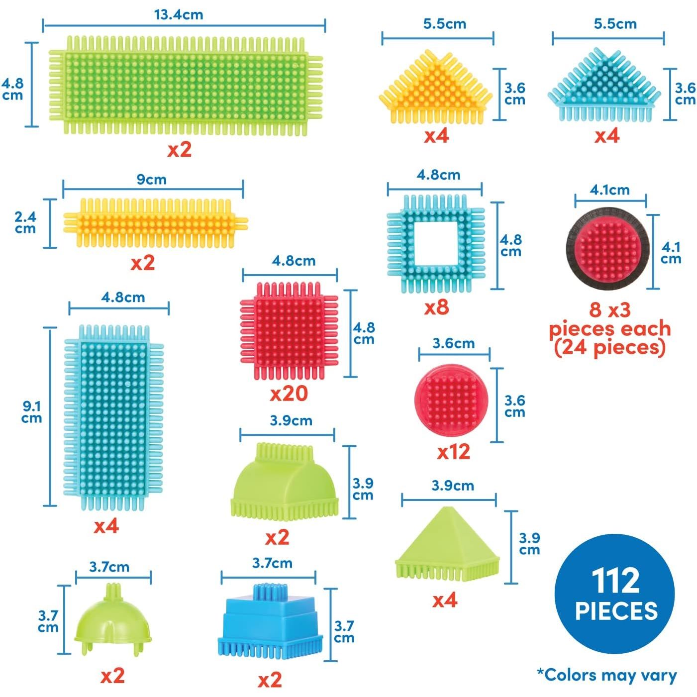 • This basic building set includes 112 pieces in assorted sizes and vibrant colors for hours of imaginative play.