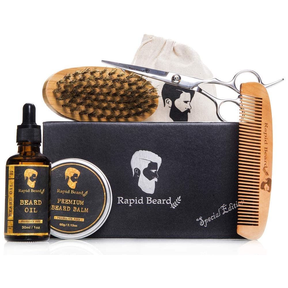 - MAKE STYLING EASY – Grooming, trimming, shaping and taming your beard & mustache was never easier with the combination of Rapid Beard’s extra sharp stainless steel barber beard scissors, 100% boar bristle brush, and the superior hold, softener properties and shaping power of the heavy duty beard balm leave in wax (“beard butter”).