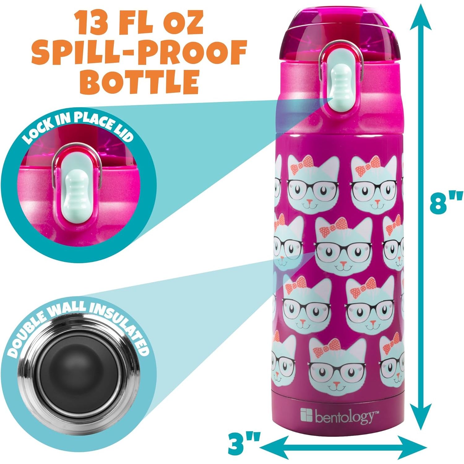 - 13 OZ Double Insulated Stainless Steel Waterbottle: Designed with an efficient Built-In Spout makes cleaning easy with no straw required. With the Lock in Place Lid, use the fliptop button to open and securely close with our durable latch. Travel mess free with Bentology's easy to use leak proof water bottles! Holds up to 13 ounces of liquid, with a mouth wide enough for most ice cubes.