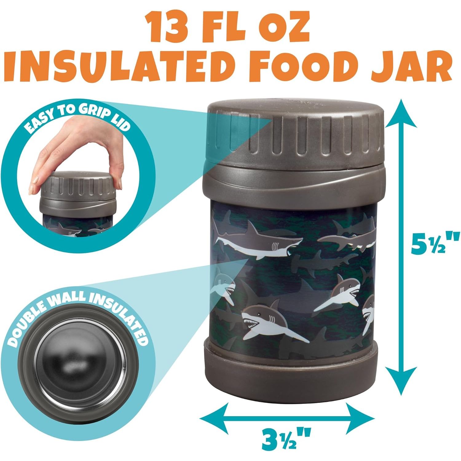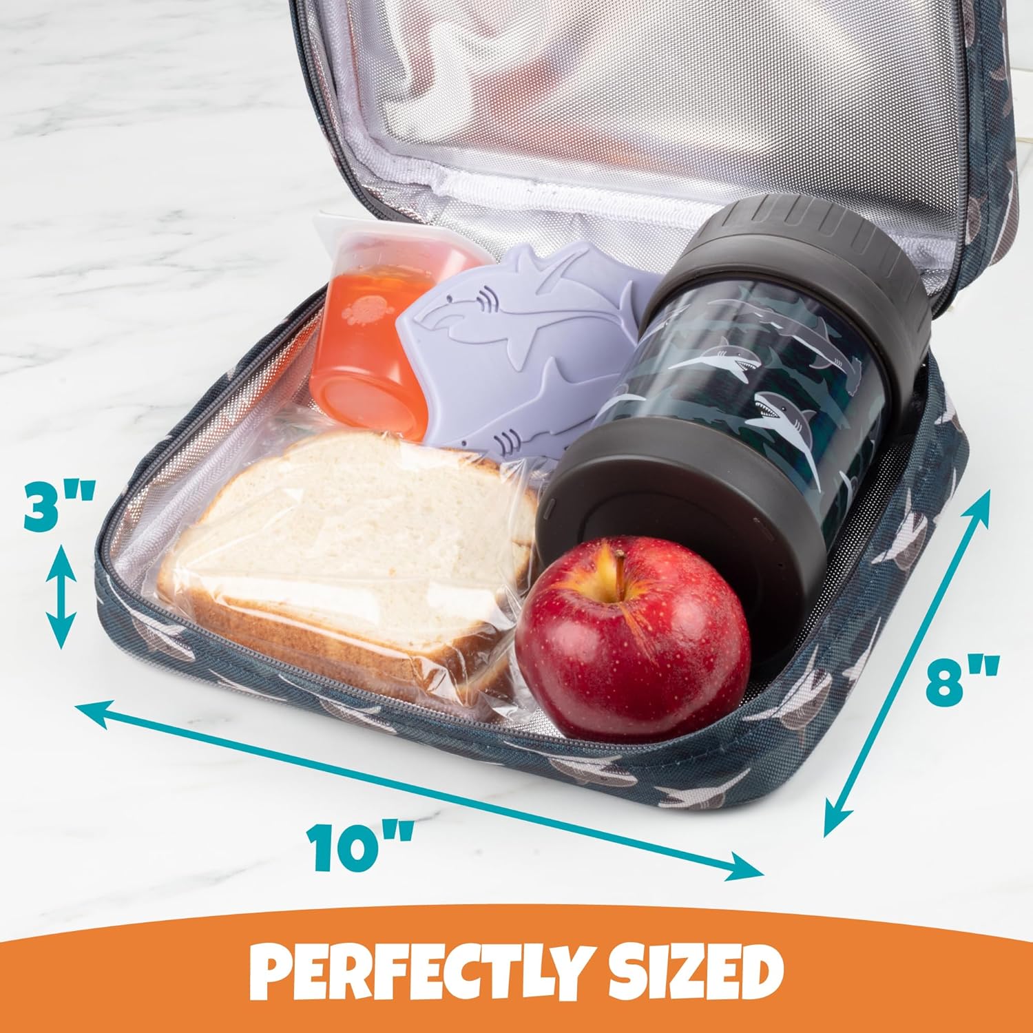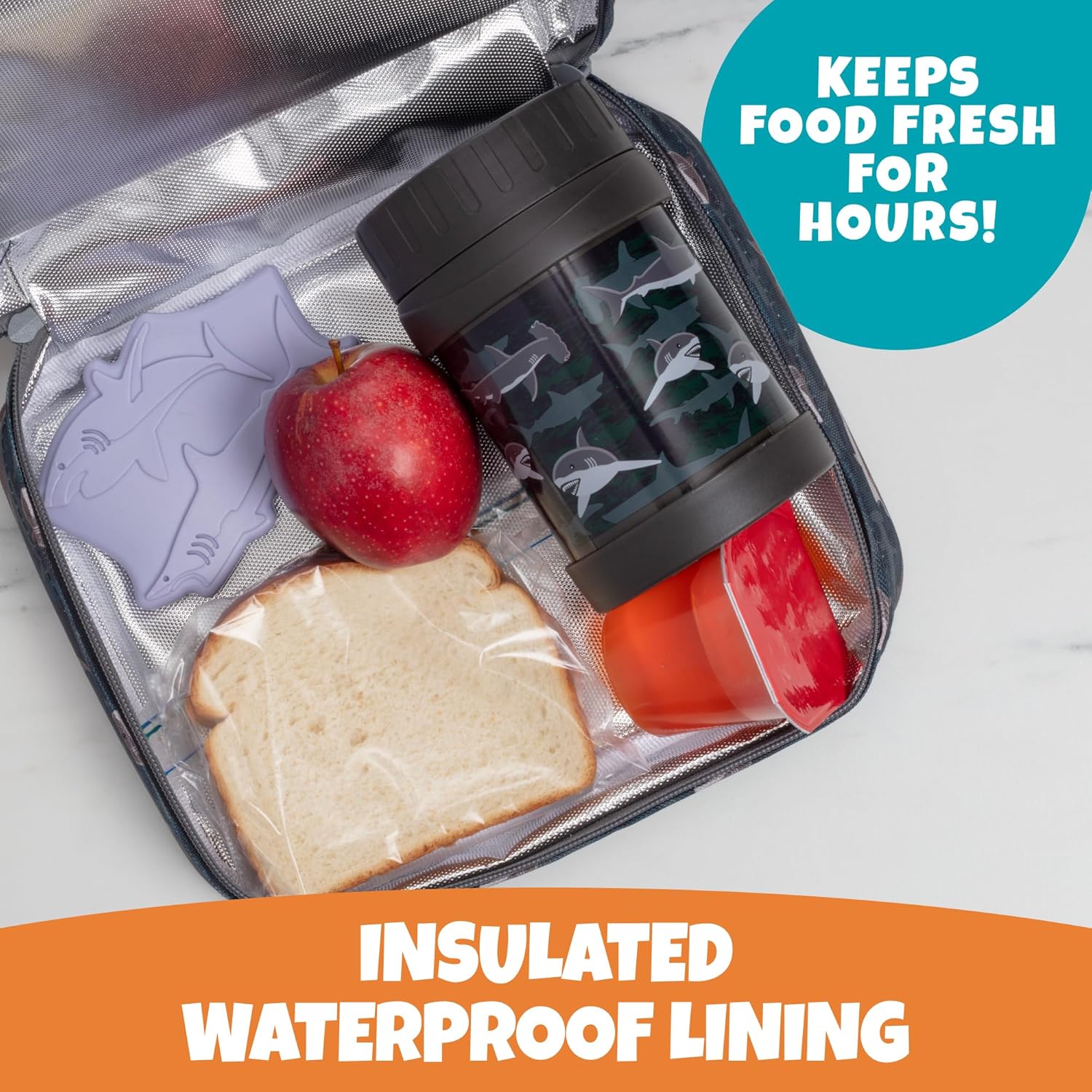 • 3 IN 1 Premium Shark Lunch Kit: Great for Back to School, this kit includes an insulated reusable lunch bag with a convenient clip-on handle, a double wall insulated 13 oz food jar and leak-proof hard ice pack. Food Safe - No Lead, BPA, Phthalates, Suitable for Ages 3+. This Listing is for 1 Bag, 1 Food Jar, and 1 Ice Pack Only.