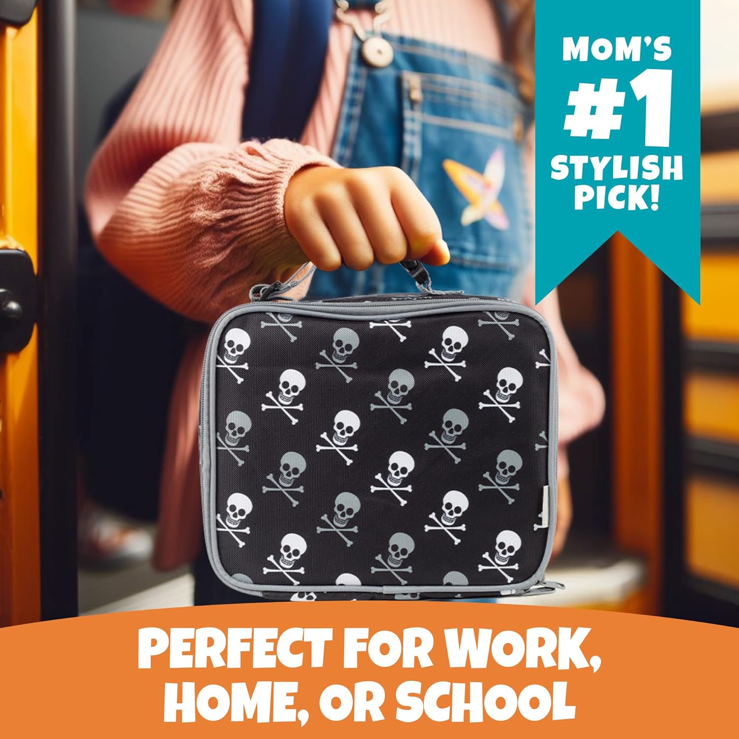 - PERFECTLY SIZED REUSABLE PIRATE SKULL & CROSSBONES LUNCHBOX: Great for Back to School, this lunch bag features a clip on handle for easy carrying! The slim design allows for easy storage without the bulk measuring 10 x 8 x 3 inches (measured from the outside) fits Bentology Bento Box containers, and is compatible with most kid Bento Box brands (sold separately). Food Safe - No Lead, BPA, Phthalates, Suitable for Ages 3+. THIS LISTING IS FOR BAG ONLY, ALL OTHER ACCESSORIES SHOWN NOT INCLUDED.