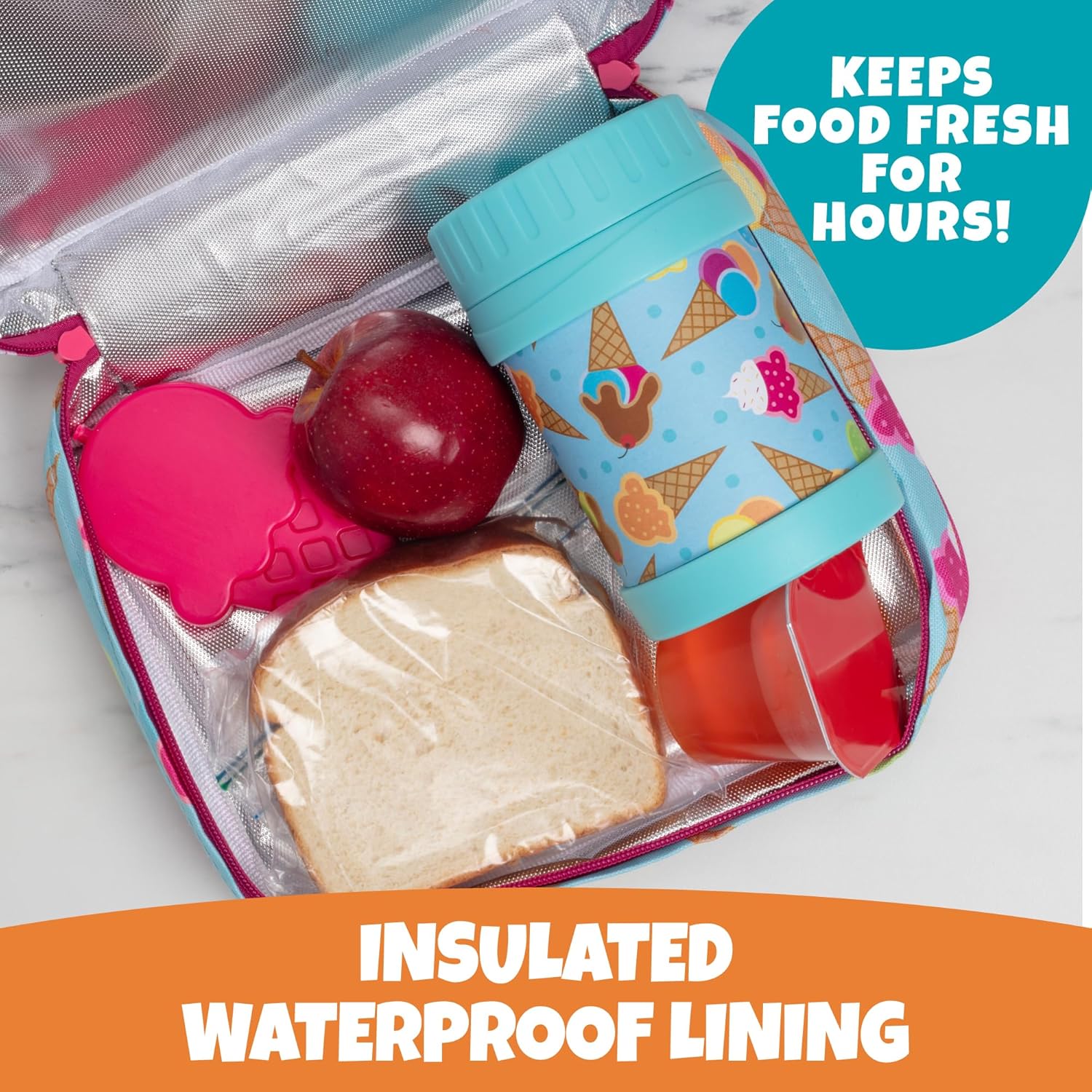 • Insulated Lunch Bag & Waterproof Lining: Kids will love this durable dessert ice cream print Bentology insulated lunch tote that keeps food and drinks fresh for hours! Ideal for bringing your lunch or snacks to School, Summer Camp, Daycare and more! Keep lunches mess free with this easy to wipe waterproof lining.