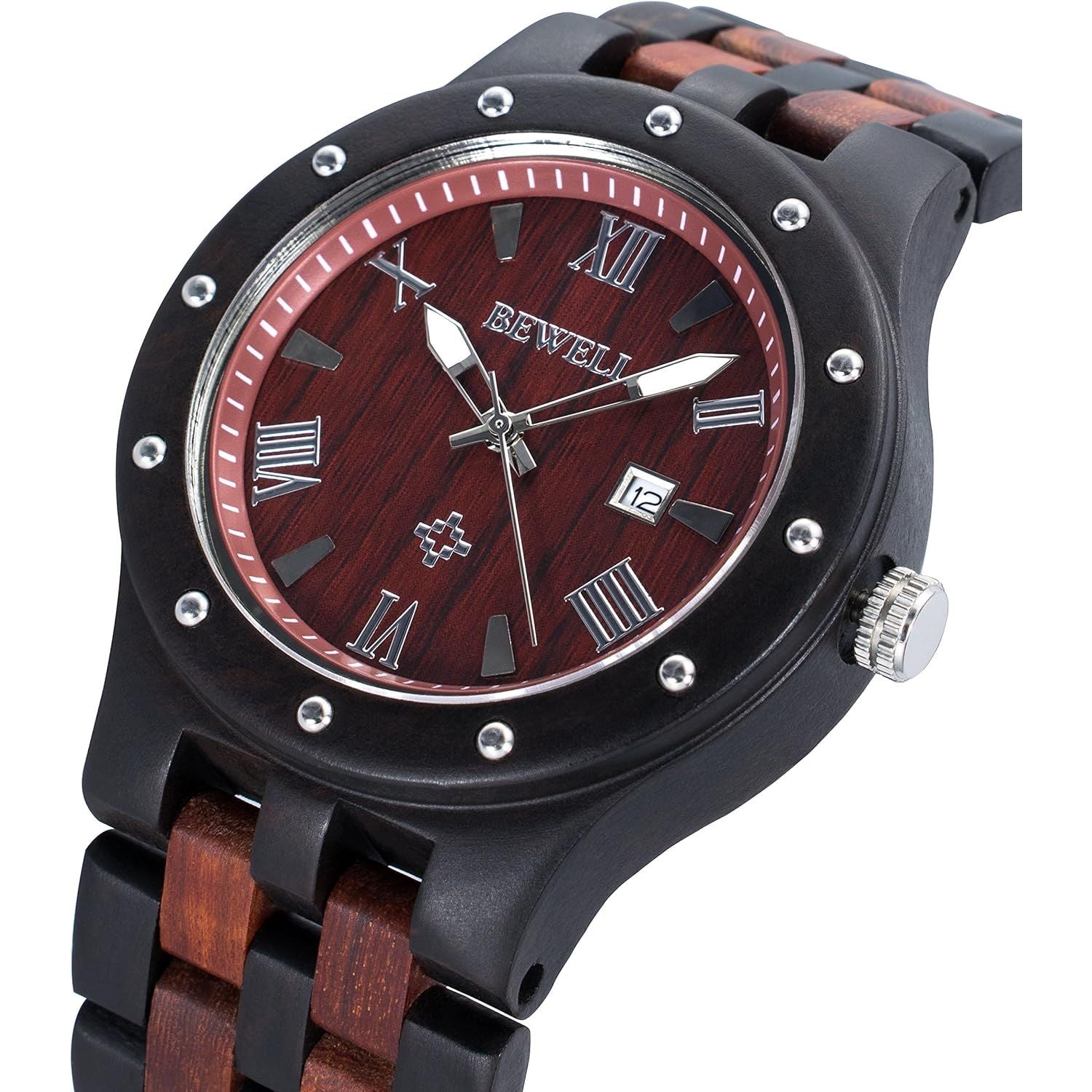 BEWELL Men's Wooden Watches Handmade Date Display Analog Quartz Luminous Wristwatch