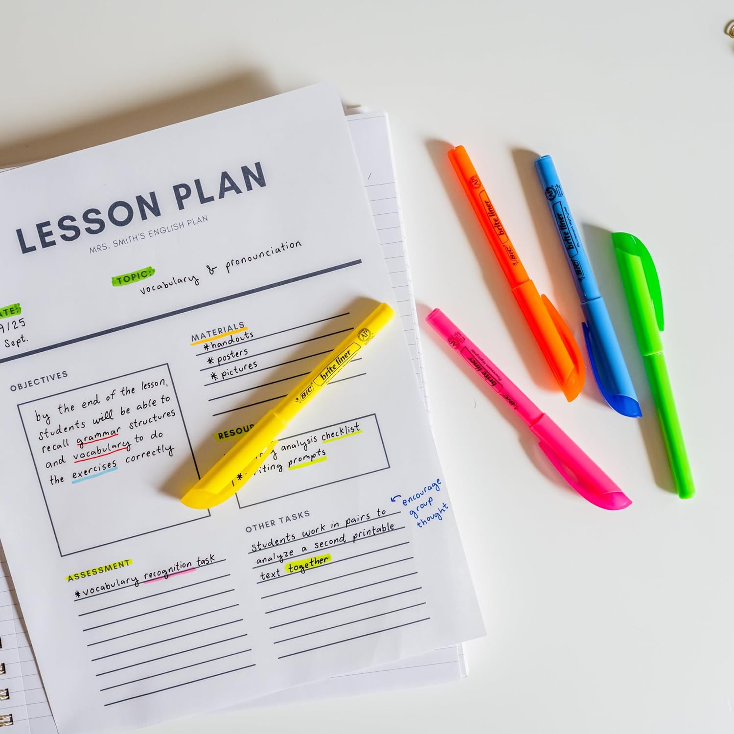 - Highlighter set with translucent ink that emphasizes what's important on the page without obscuring the highlighted text