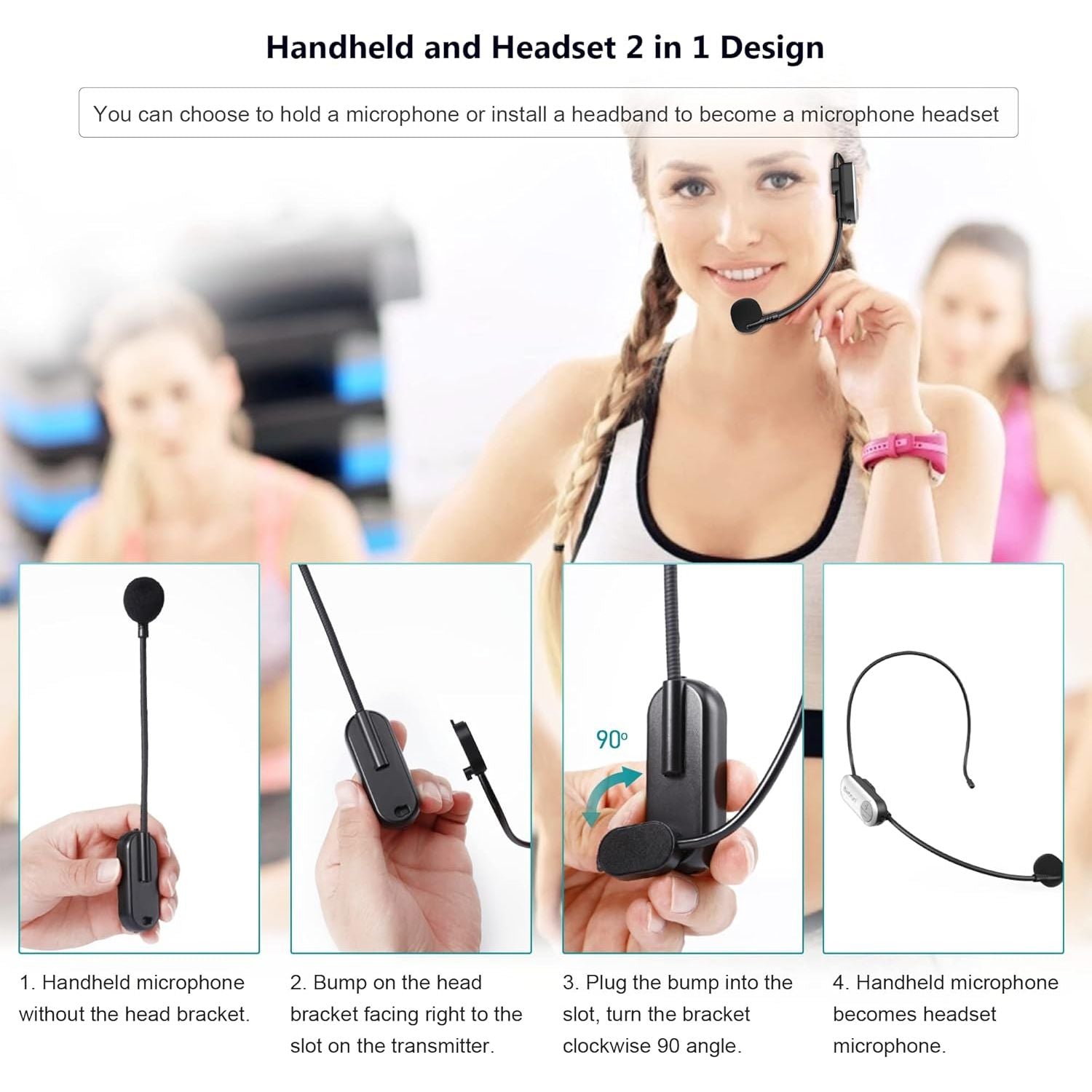 • Easy to use: Please turn on the transmitter and receiver power switches, the blue light will flash for approximately 2s. Indicator light stops flashing after a successful match, then you can use it. No further operation. ●Headset and handheld is 2 in 1 design, easily change the handheld mode to headset mode to meet your needs.