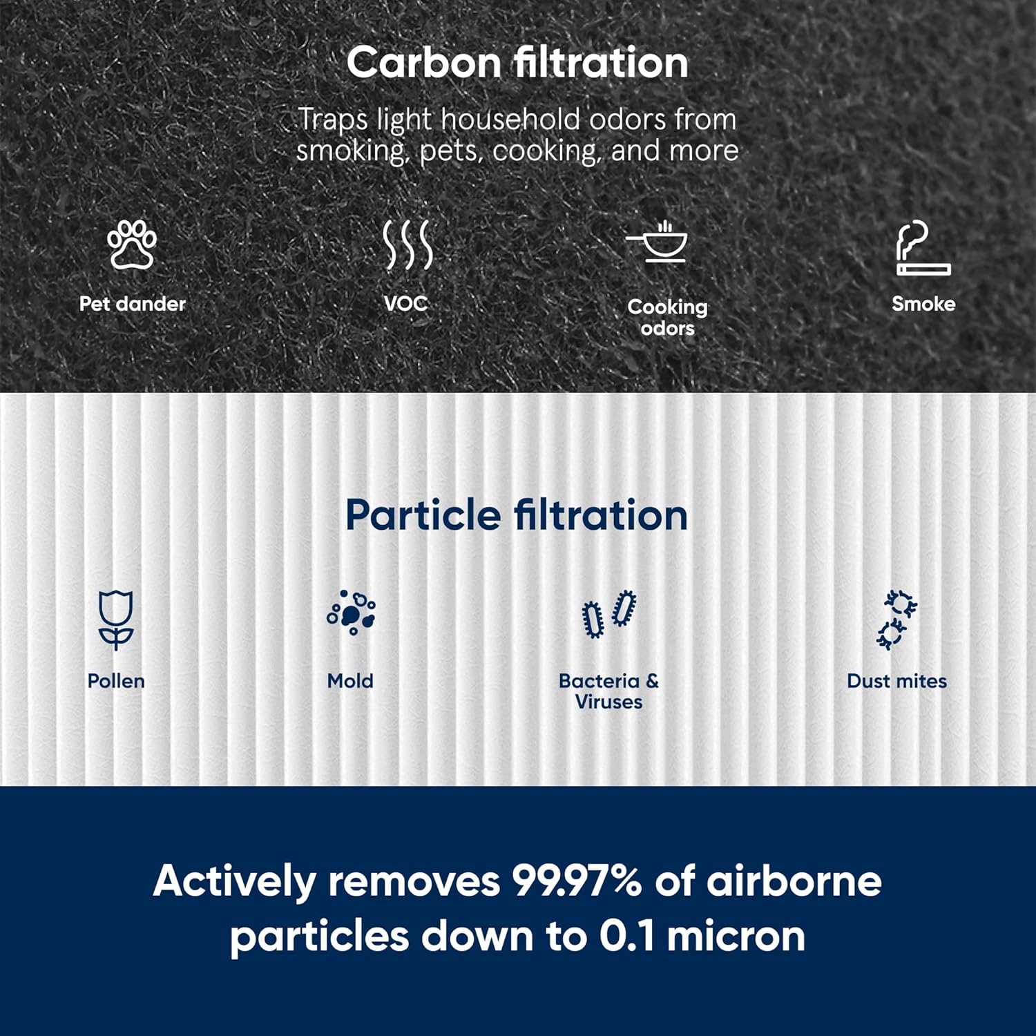 The Blue Pure 411 Particle and Activated Carbon Replacement Filter protects against both gaseous and particulate impure. An activated carbon mesh layer eliminates harmful gaseous pollutants such as volatile organic compounds (VOCs), tobacco smoke, and other smells. In addition, advanced polypropylene filter media removes particle pollutants down to 0.1 micron in size from your indoor air, such as pollen, dirt, and pet dander. Using a 360-degree air intake and up to 4 times the filter surface area than competing replacement filters, the Blue Pure 411 Particle and Activated Carbon Filter lasts longer, on average from 6 months to a year. Subscribe and save up to 10% on auto-delivered filters when replacement is needed; We recommend replacing your filter about every 6 months depending on usage. NO COMPARISON – 4X FILTER SURFACE AREA and 360 AIR INTAKE: Blueair models with HEPASilent's mechanical and electrostatic filtration produced higher CADR, lower noise, and had lower energy consumption vs. the same models with only mechanical filtration (H13 filter). *Tested on Eli, Influenza A (H1N1), A.niger with a minimum reduction rate of 99.9% in 60min.