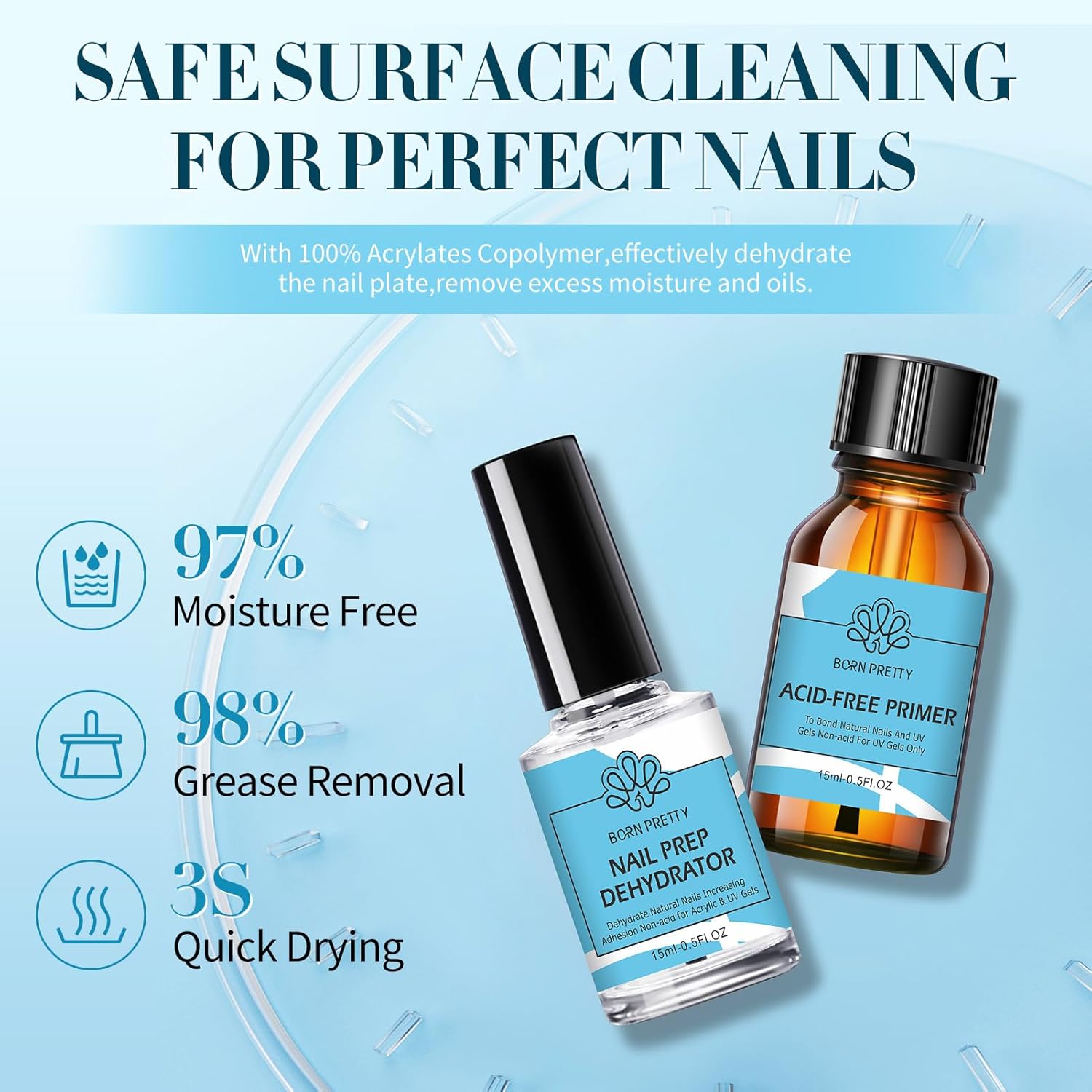 - BORN PRETTY Nail Dehydrate and Primer, 15ml HEMA&TPO Free Dehydrator for Acrylic and Gel Nail Polish, Non Acid Primer for U V Gels, No Burn Fast Air Dry Nail Prep Dehydrator Set, 0.5oz