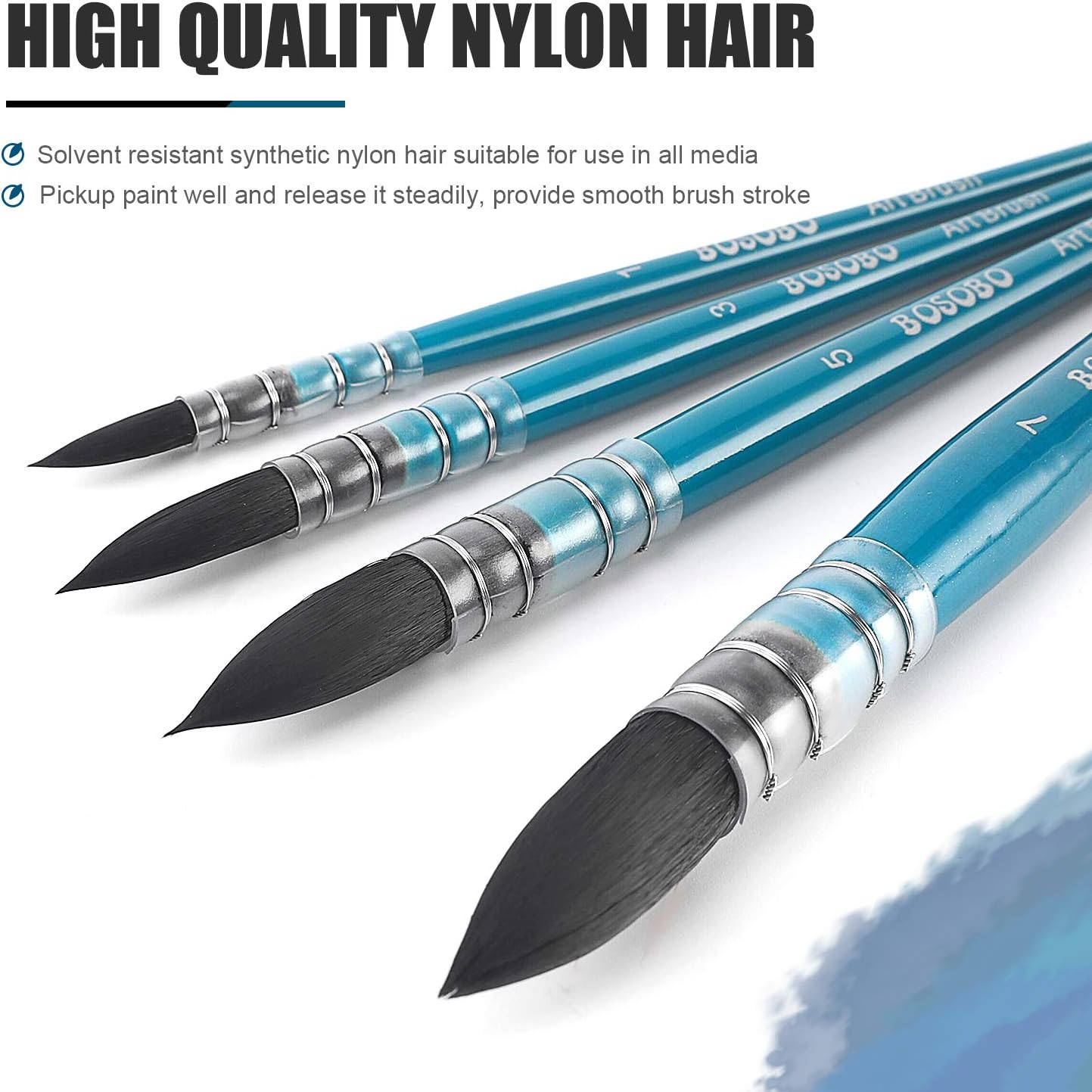 - ► PREMIUM SYNTHETIC NYLON HAIR: Innovative synthetic bristle resist to solvent, suitable for use in all media including watercolor, acrylic, oil, enamel, cel-vinyl, gouache and ink. Pickup paint well and release it smoothl. Provide smooth brush marks and spring back perfectly after each stroke.