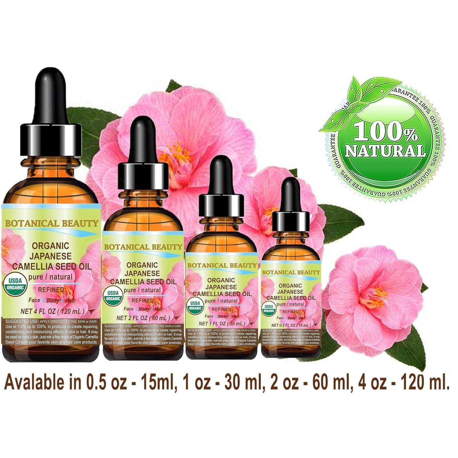 - Botanical Beauty Japanese ORGANIC CAMELLIA Seed Oil. 100% Pure Natural Undiluted Refined Cold Pressed Carrier Oil to revitalize and rejuvenate the hair, skin and nails. 4 Fl. oz 120 ml
