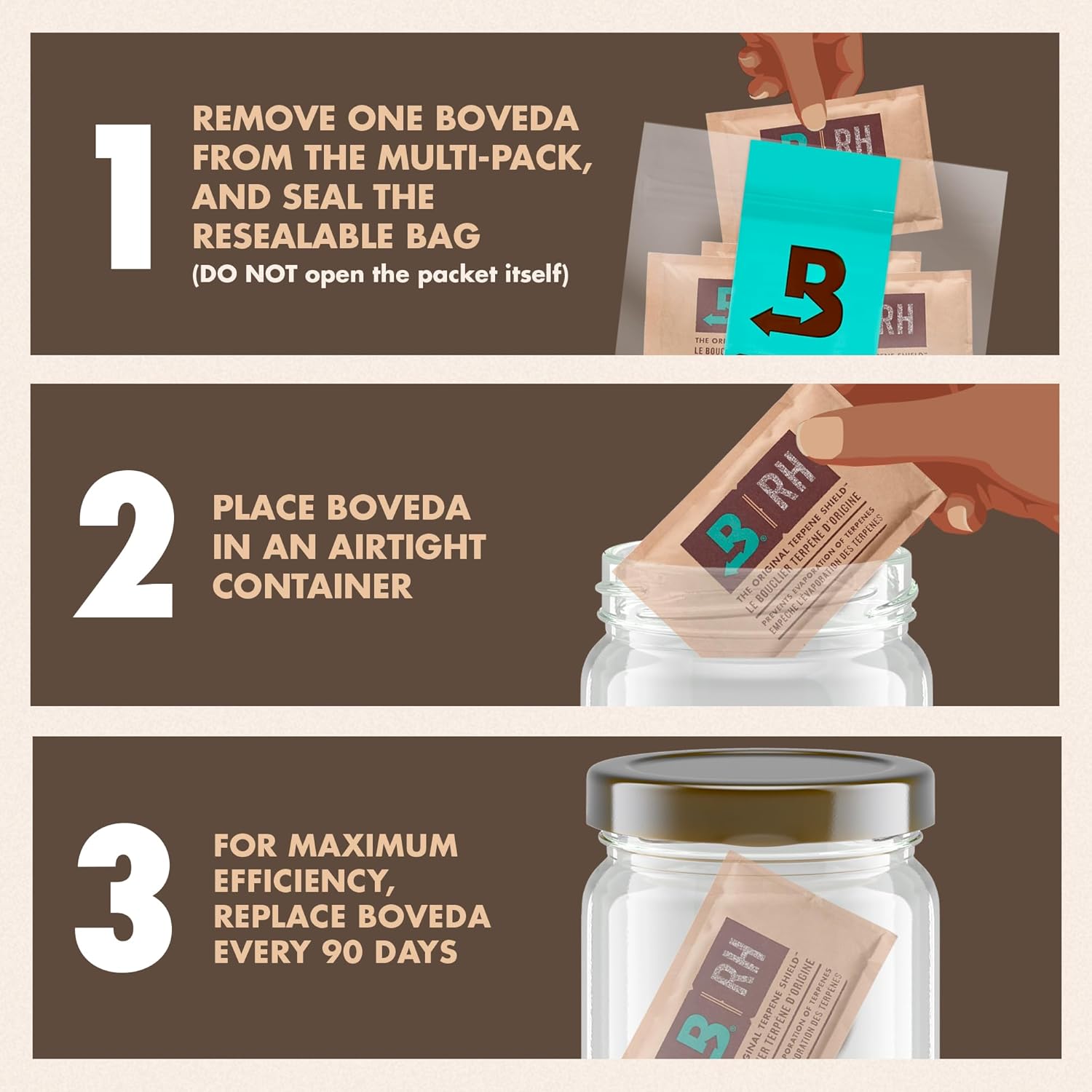 - HOW TO USE: It takes seconds to keep your natural items fresh. Remove the moisture packs from the resealable bag, slip the Boveda 62 humidity pack into your airtight container, fill it with your items, & close it. BOVEDA DOES THE REST. DO NOT cut or open the brown humidity packet. Replace every 3 months. You'll know it's time to swap out Boveda when it becomes hard and crunchy. NEVER MIX the 62% with any other %RH.