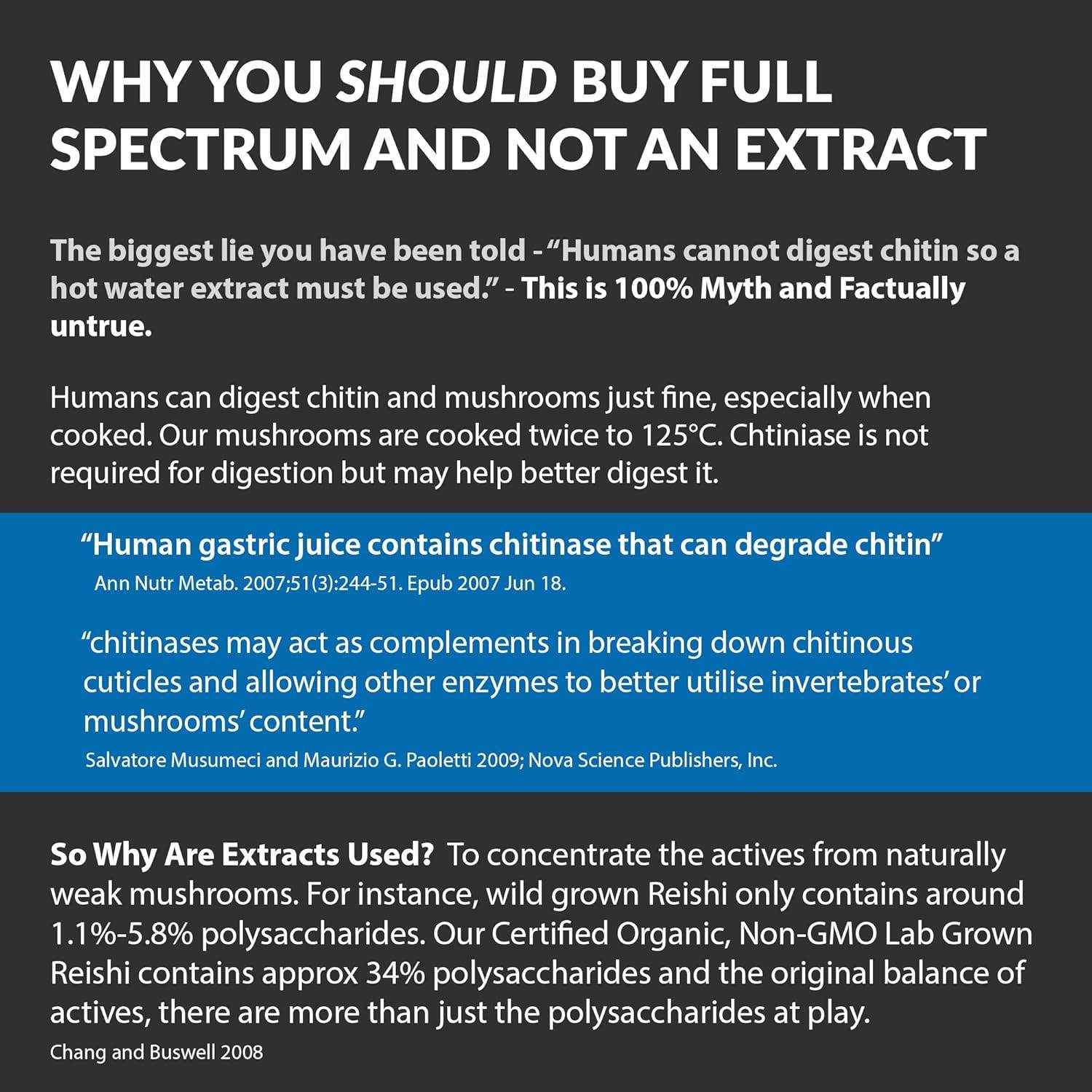 Unlike extracts, which are freeze dried water extract, our capsules are filled with actual, real whole-mushroom powder - nutrients and all.