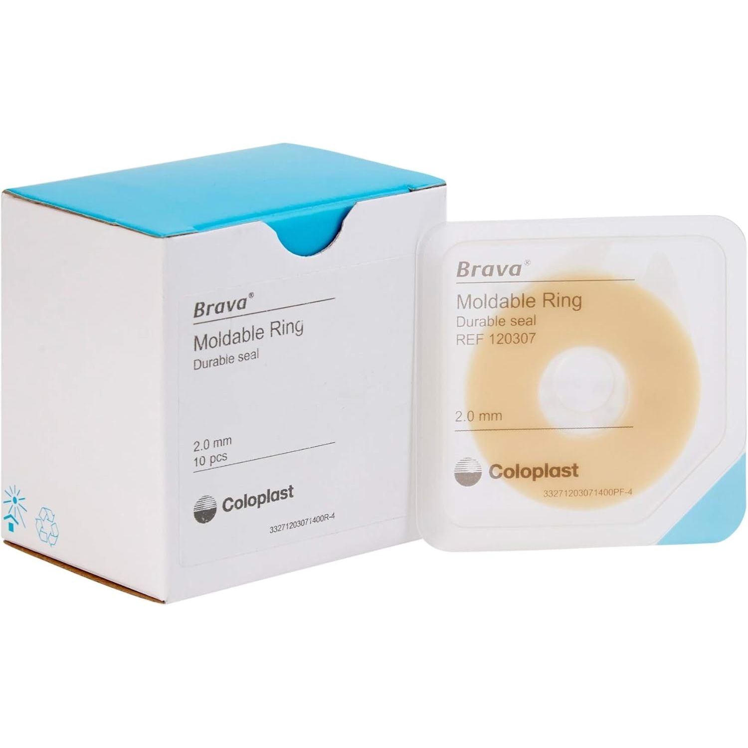 The Coloplast Brava Ostomy Moldable Ring is a durable seal that provides a secure fit between the stoma and the pouch. It works well for ileostomies and urostomies. The Coloplast Brava moldable ring protects the skin from stoma output while absorbing moisture without breaking down or dissolving. This enables the ring to maintain a constant fit throughout the wear time.The Coloplast moldable ring adheres to the skin, even with creases or folds, providing confidence and comfort. It's simple to mold into a shape that fits the contours of the body. It provides constant even pressure, securing the gap between the barrier and stoma to prevent leaks. The moldable ostomy ring guides output directly into the pouch, so it never touches the skin. - The Coloplast Brava moldable ring maintains a secure fit between the stoma and the pouch. It adheres to uneven skin surfaces as a tight and constant seal that stops leakage. The moldable ostomy ring safeguards the skin from stoma output, preventing moisture-causing irritation. The ring doesn't breakdown or dissolve. It's easy to mold the Coloplast moldable ring to fit the wearer.
