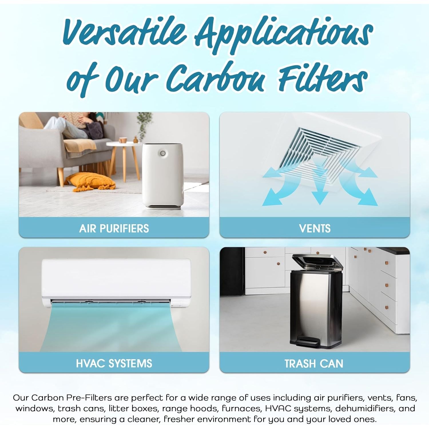- UNIVERSAL CUT TO FIT: Each activated carbon air filter comes with two hook & loop tapes for easy attachment & can be adjusted to fit a wide range of applications. Simply cut the activated carbon air filter to the required size for a perfect fit. These versatile carbon filters are ideal for use in air purifiers, vents, fans, windows, trash cans, litter boxes, range hoods, furnaces, HVAC systems, dehumidifiers, & many other uses. This customizable design ensures no gaps for unfiltered air.