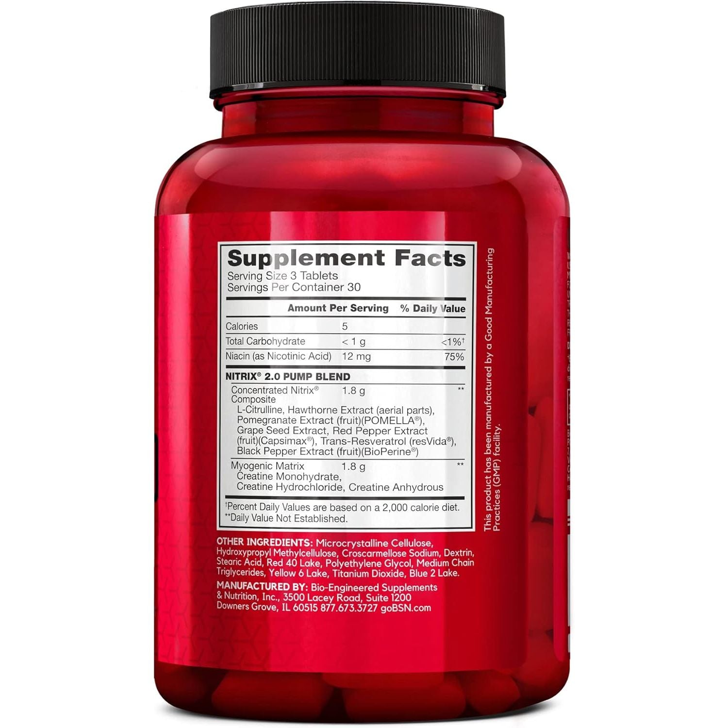 - BSN NITRIX 2.0, Workout Supplement, Nitric Oxide Precursors, 3g Creatine, 3g L Citrulline, L-Citrulline, Supports Workout Performance, Pumps, Muscle Recovery and Endurance, 90 Tablets, 30 Servings
