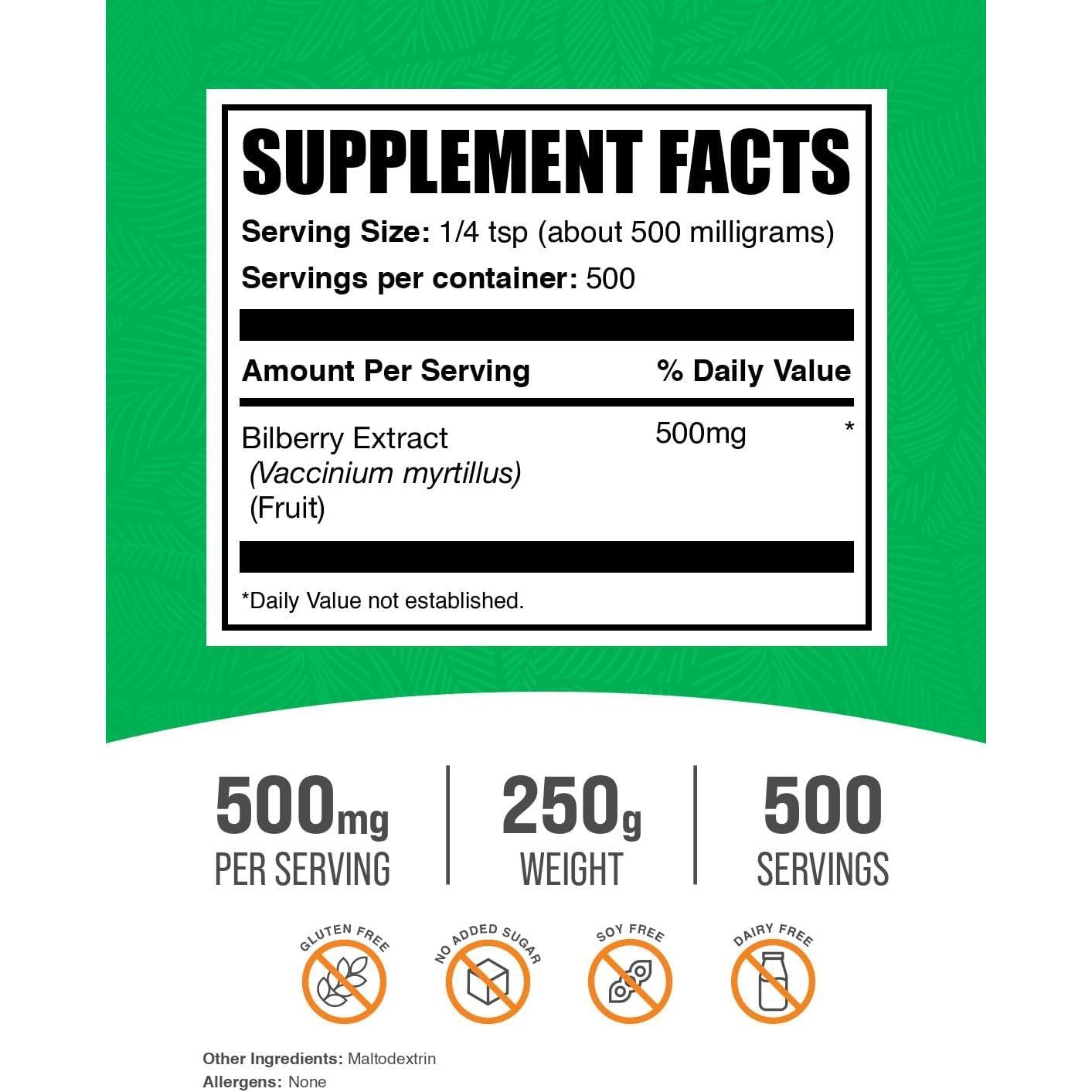 - BulkSupplements.com Bilberry Extract Powder - Bilberry Extract Supplement, Herbal Supplement - Vegan & Glulten Free, 500mg per Serving, 250g (8.8 oz) (Pack of 1)