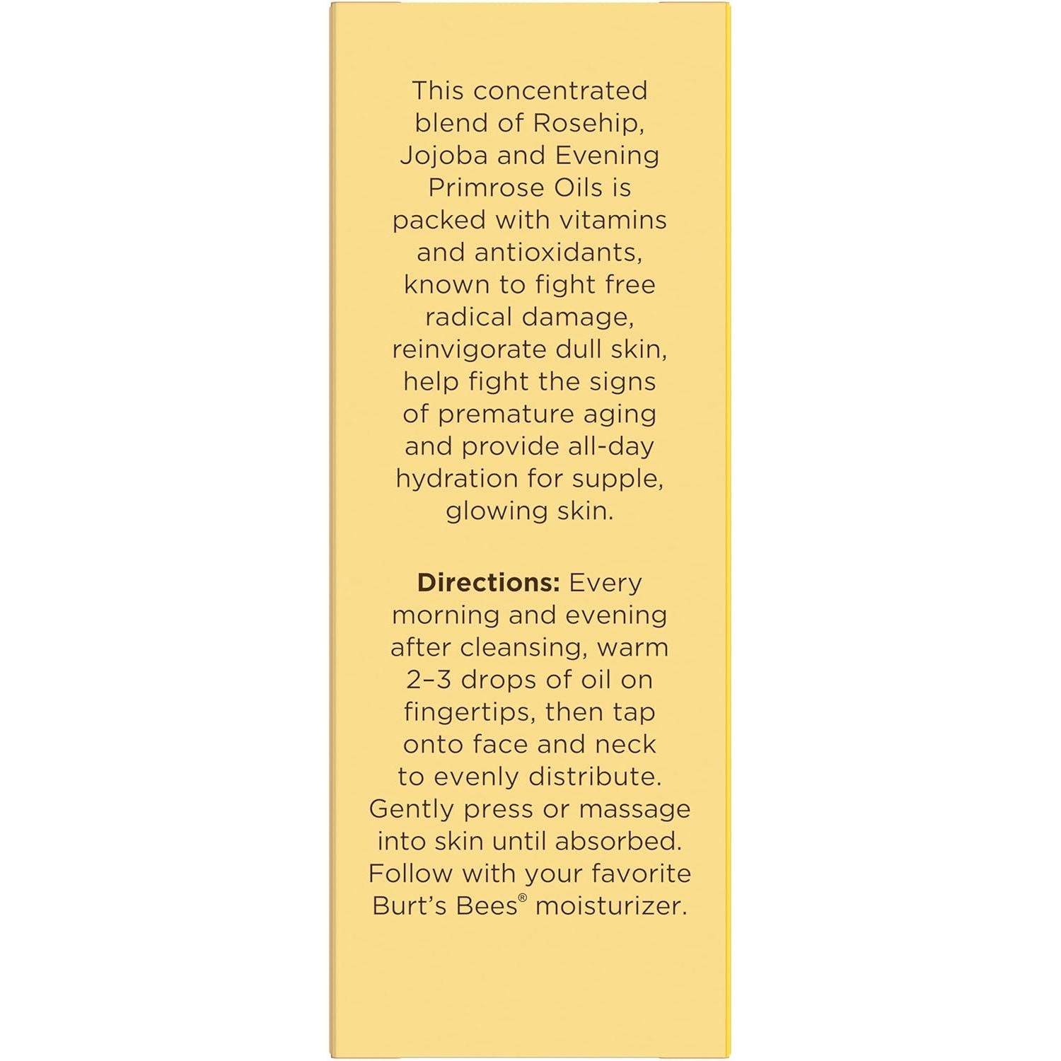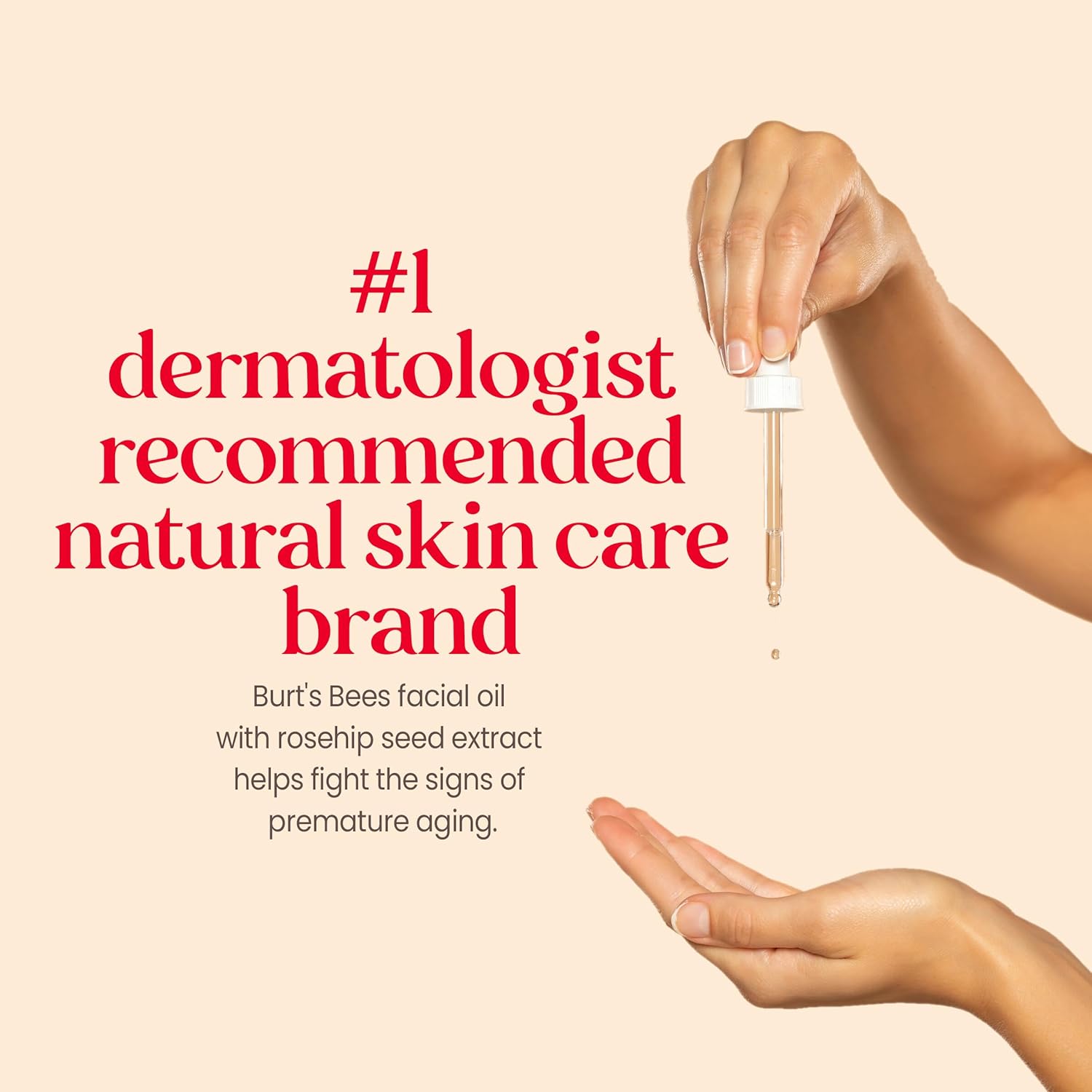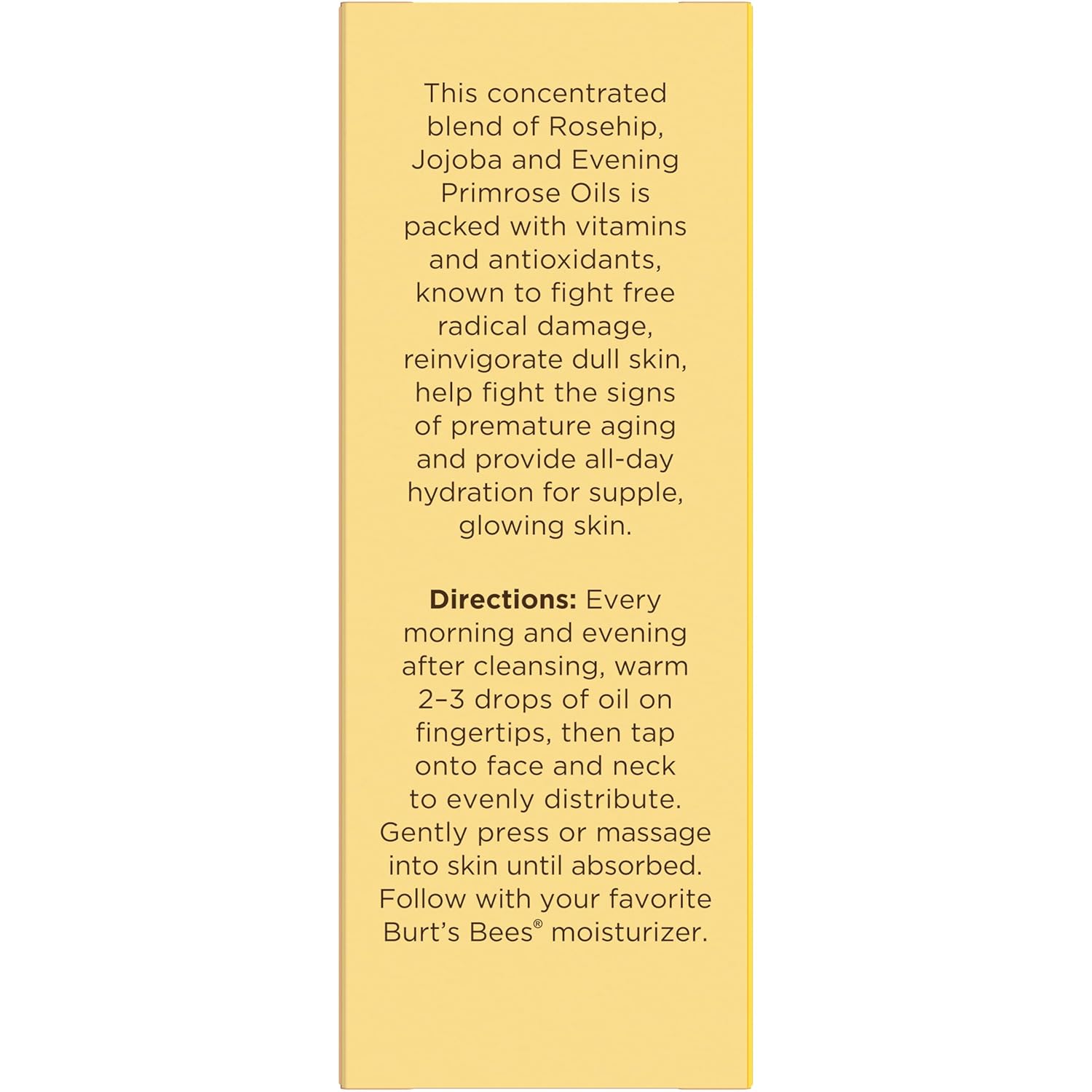 Enjoy a rejuvenating dose of hydration with this simple yet powerful Burt's Bees Facial Oil. This concentrated blend of rosehip, jojoba and evening primrose oils is rich in essential fatty acids and packed with vitamins and antioxidants. Together, these ingredients are known to fight free radical damage, reinvigorate dull skin, reduce the signs of premature aging and provide all-day hydration for supple, glowing skin. Ideal for normal to dry skin, this rosehip seed oil is clinically proven to reduce the appearance of fine lines and wrinkles. The 100% natural origin face oil is formulated without parabens, phthalates, petrolatum or SLS, made with ingredients from nature and Leaping Bunny Certified (never tested on animals). Every morning and evening, gently press or massage this facial oil into skin until absorbed. Follow with your favorite moisturizer. Pair Burt's Bees Facial Oil with other Burts Bees skin care products, including facial cleansers, facial toners and facial creams. Burts Bees is the No. 1 dermatologist-recommended natural skin care brand (1). (1) Based on a September 2021 NielsenIQ national survey of U.S. Dermatologists