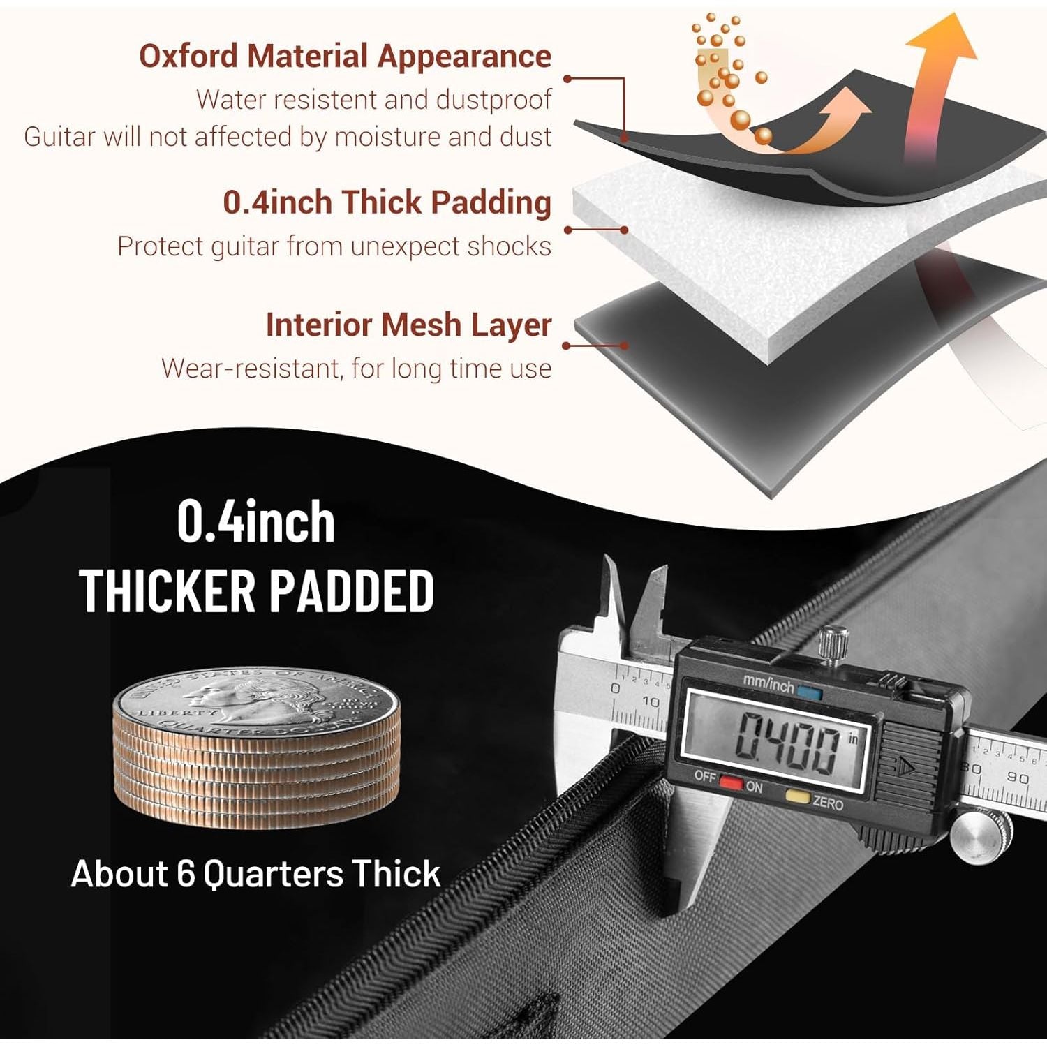 - Easy to Carry: Dual adjustable shoulder straps + three handles for convenience. Carry as a backpack using the shoulder straps to reduce the stress of the guitar, or take it directly in your hand with the side handle.