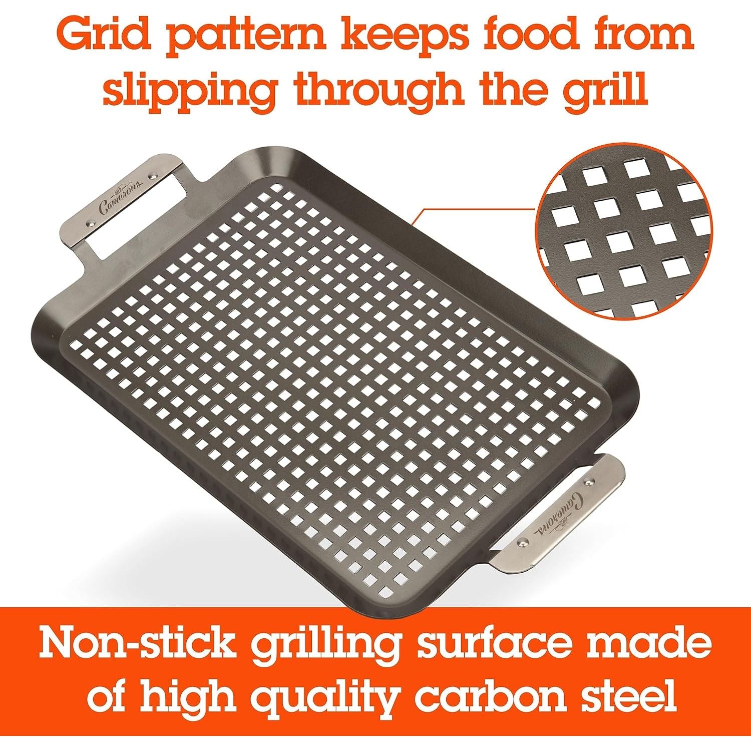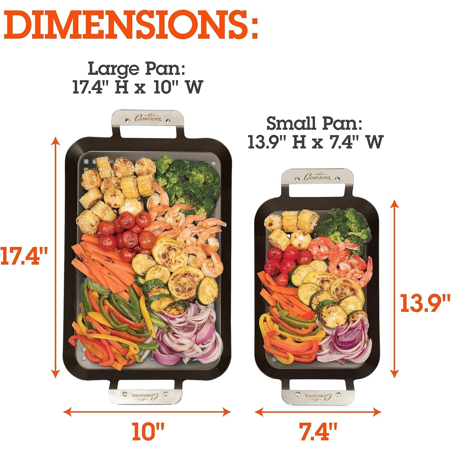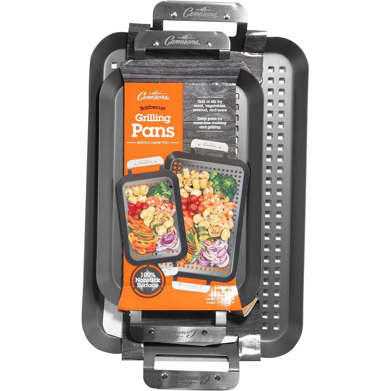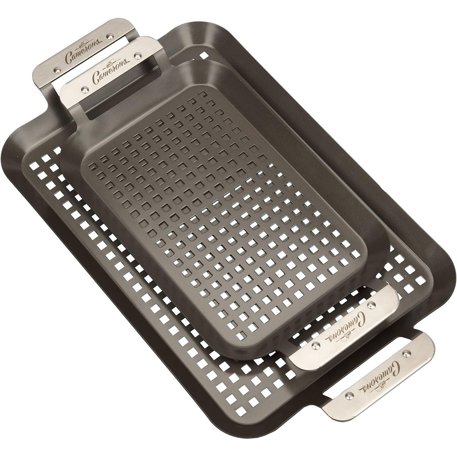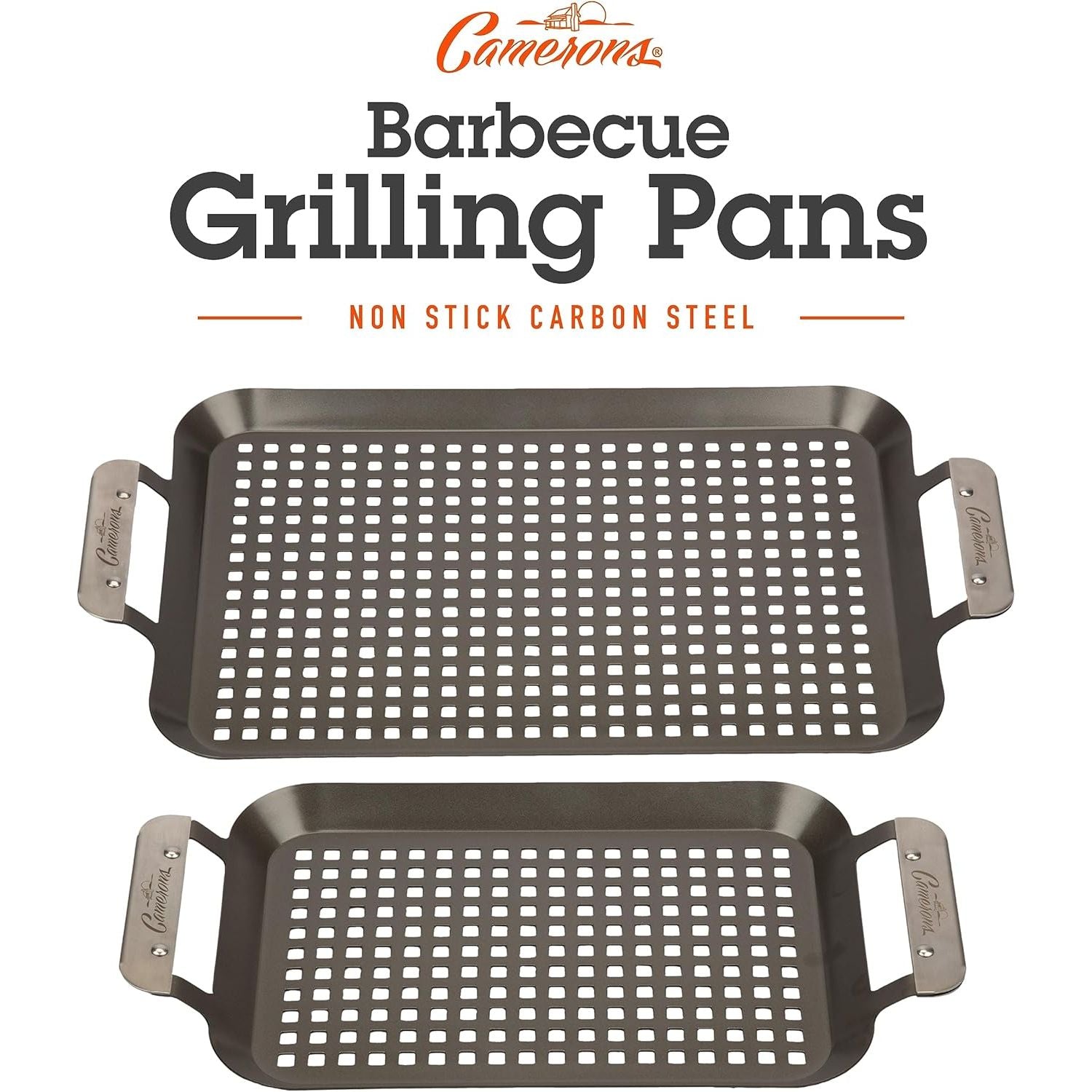 - Camerons BBQ Grill Topper Grilling Pans (Set of 2)- Non-Stick Barbecue Trays w Stainless Steel Handles - Indoor Outdoor use for Barbecue & Smoked Meat, Vegetables & Seafood - Grill Essentials Gift Set