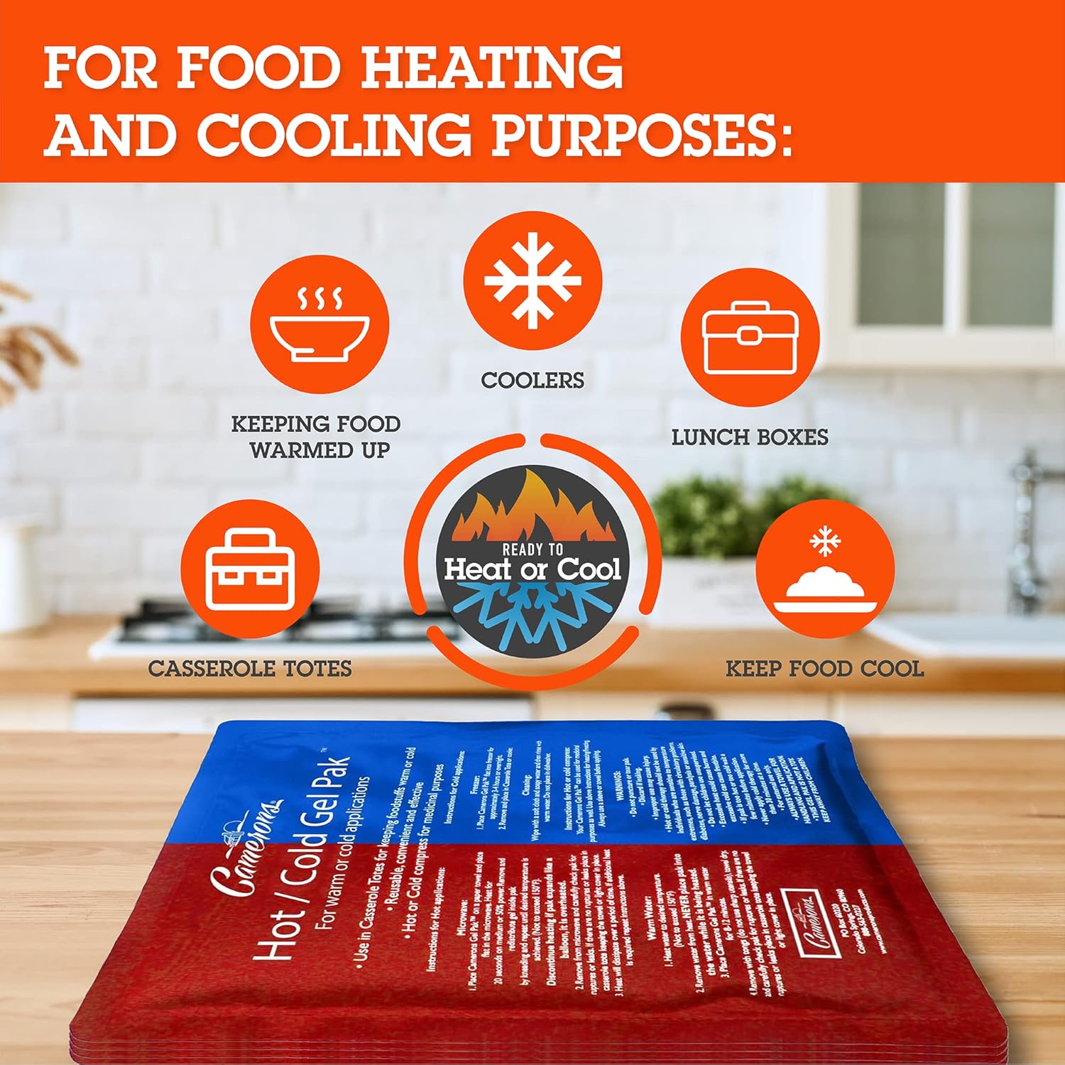 - Keeps your Food Warm or Cold - whether bringing a casserole dish to a party or packing a cool salad for your lunch, stick a Camerons Gel Pak in your casserole carrier or lunch box to keep your food at its desired temperature throughout the day whether at work school, a picnic, or a party.